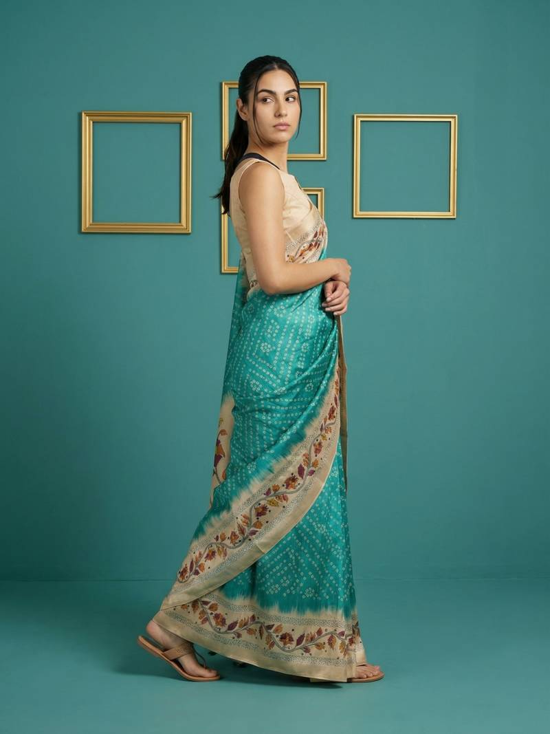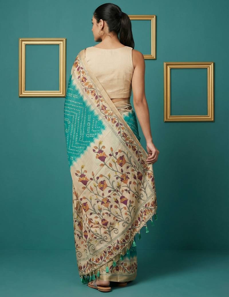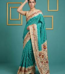 Sea green printed silk blend saree with beige floral border & designer pallu | traditional & festive wear saree