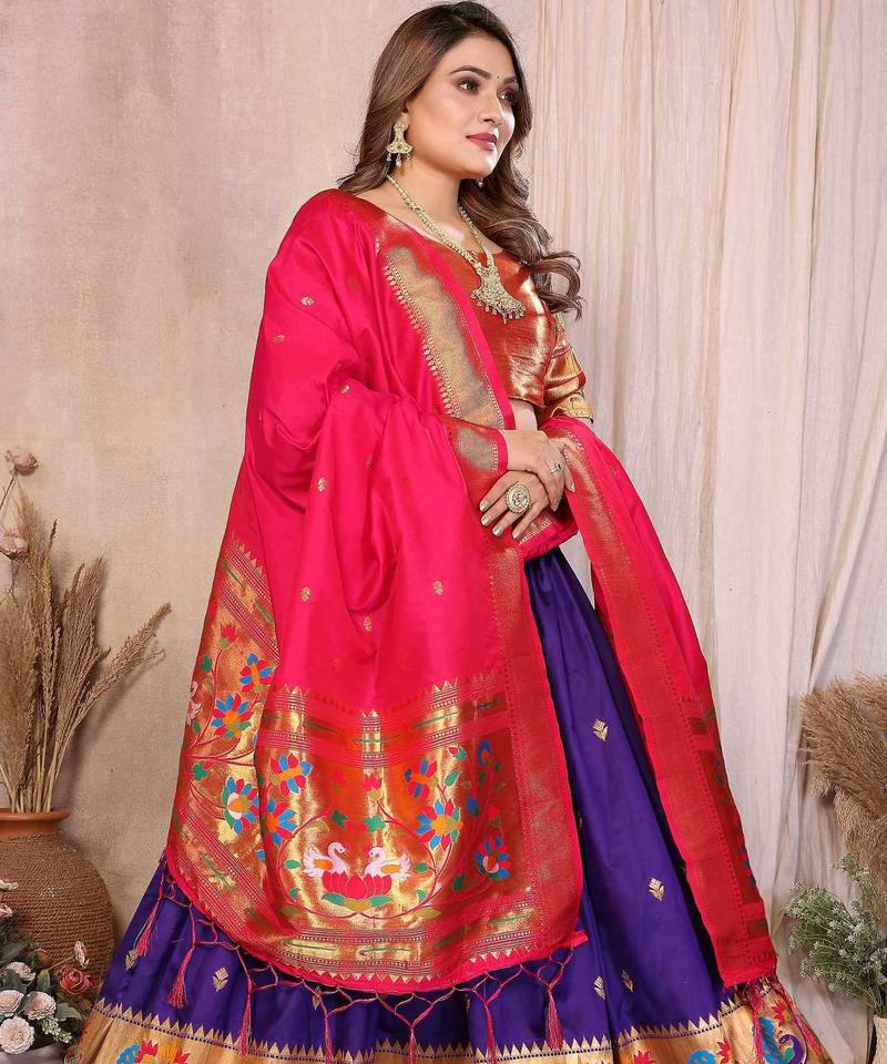 | Product Description | Step Into Timeless Elegance With This Stunning Silk Lehenga Choli Set, Beautifully Designed With A Traditional Paithani Inspired Border Featuring Vibrant Peacock And Floral Motifs. The Rich Blouse With A Lustrous Finish Adds A Royal Touch, While The Flowing Lehenga Offers Comfort And Grace. Paired With A Contrasting Dupatta Adorned With Zari Weaving, This Ensemble Perfectly Blends Heritage And Modern Style. Ideal For Weddings, Festive Occasions, And Cultural Celebrations, This Outfit Brings Out A Regal Charm. Pair It With Statement Jewelry To Create A Captivating And Sophisticated Ethnic Look. |