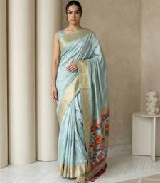 Sky blue pallu woven zari buti & traditional motifs work silk blend fabric traditional festive style
