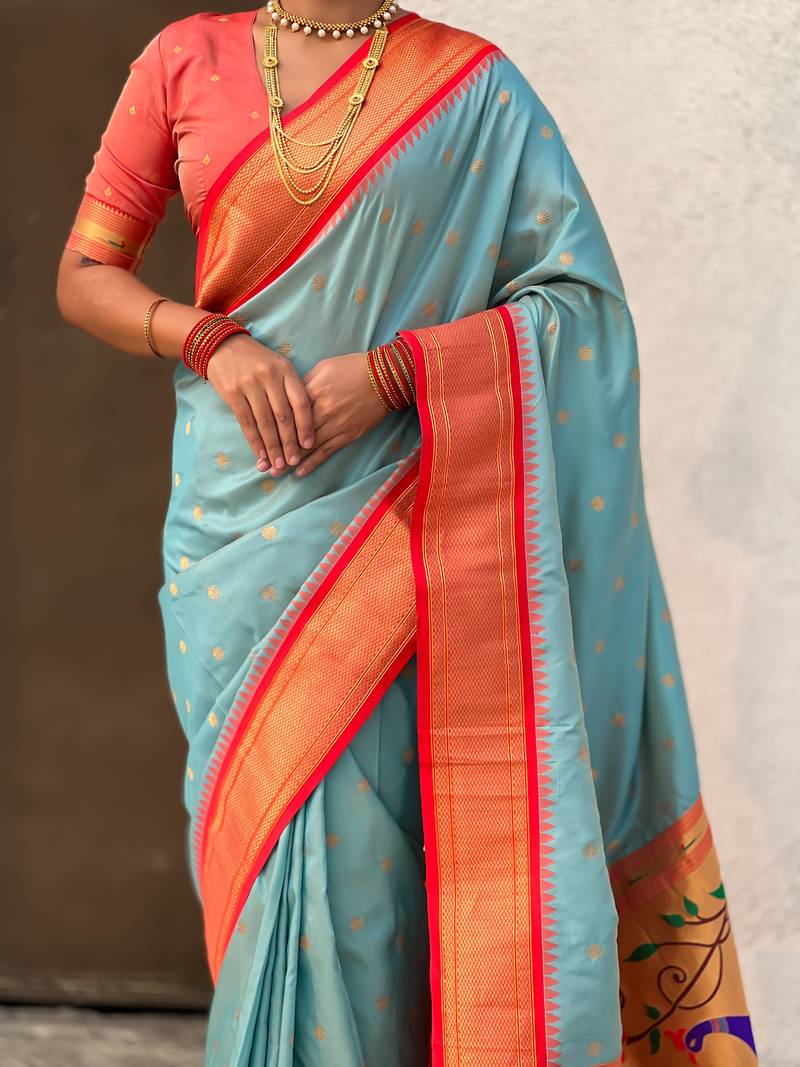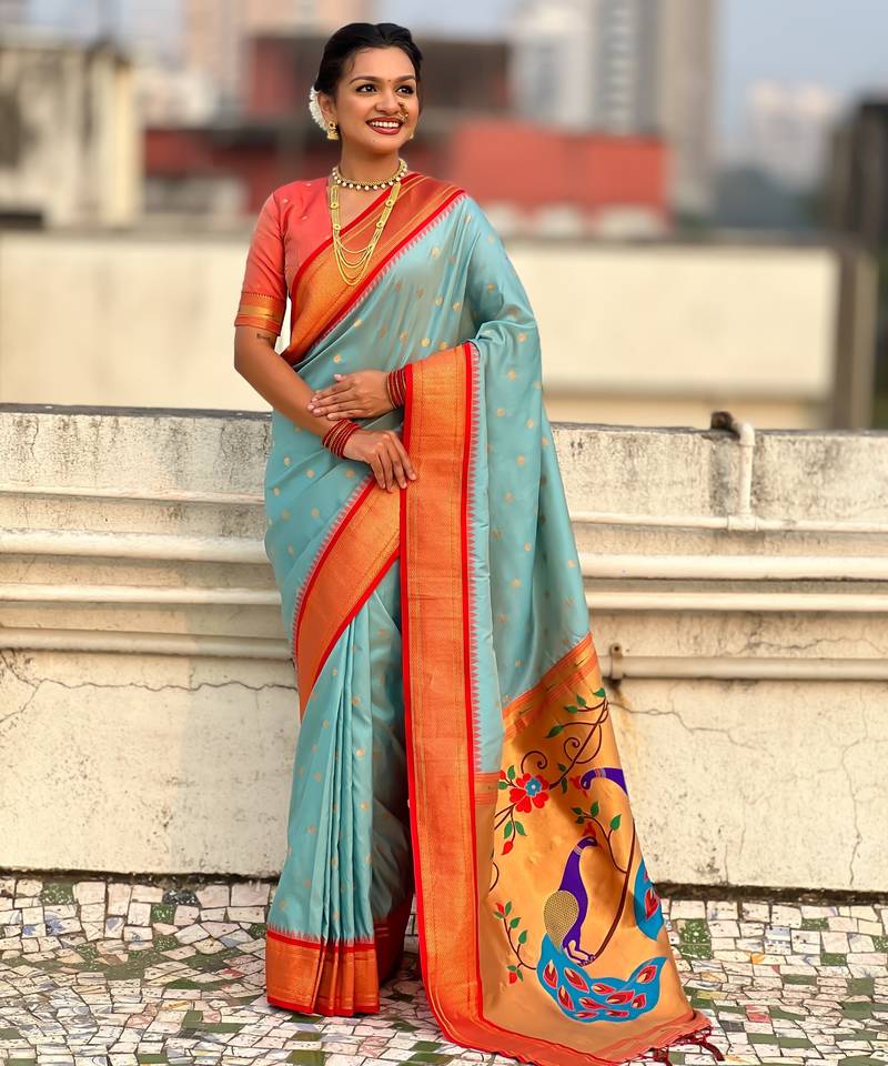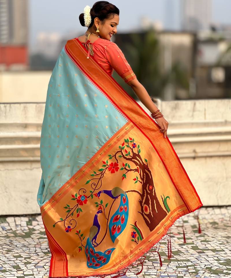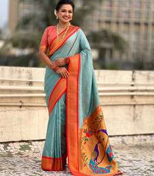 Sky blue silk blend saree with orange zari border & peacock printed pallu | festive traditional wear saree