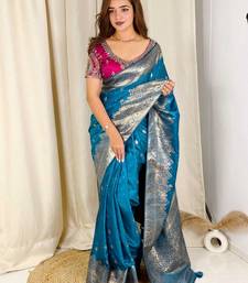 Teal banarasi satin silk zari weaving saree with embroiderd blouse piece