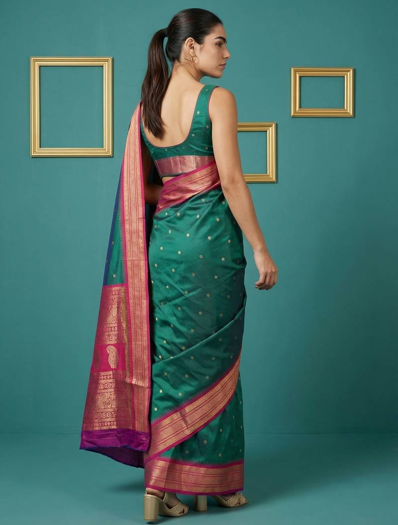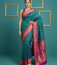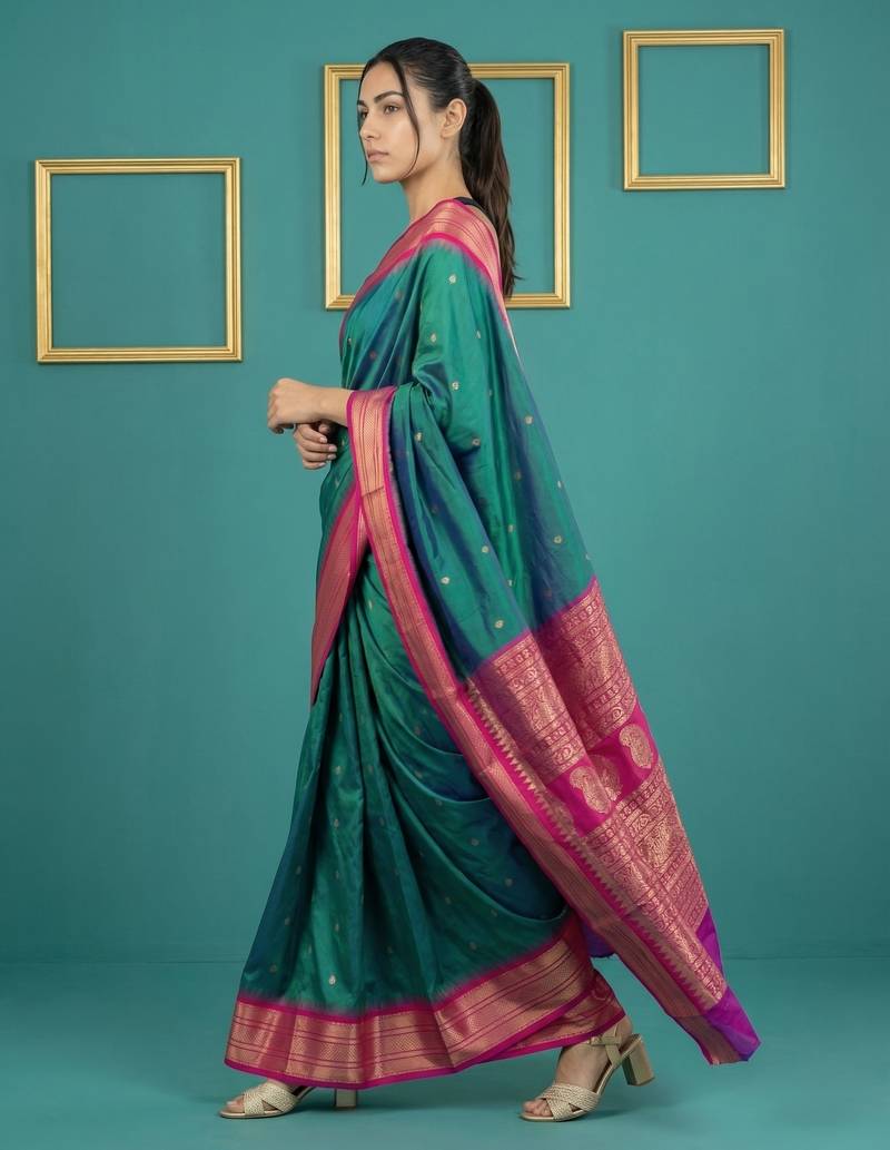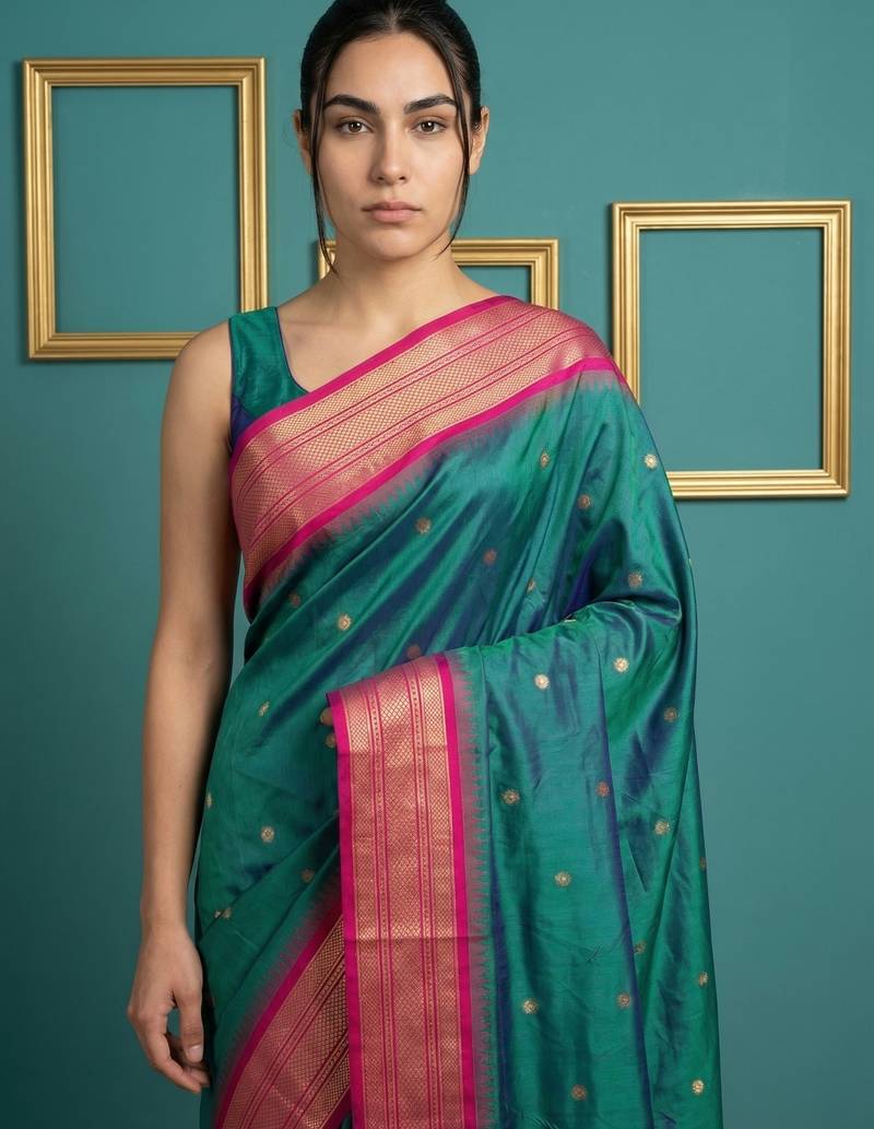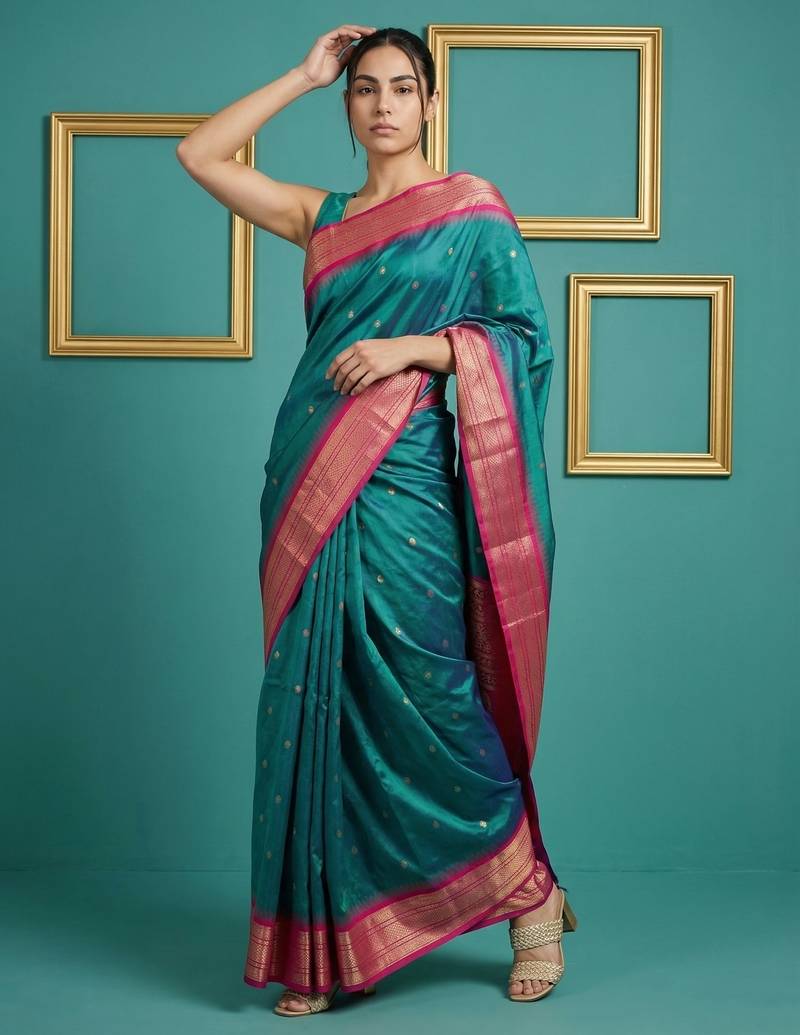 Teal border woven zari border & buti work silk blend fabric traditional festive style