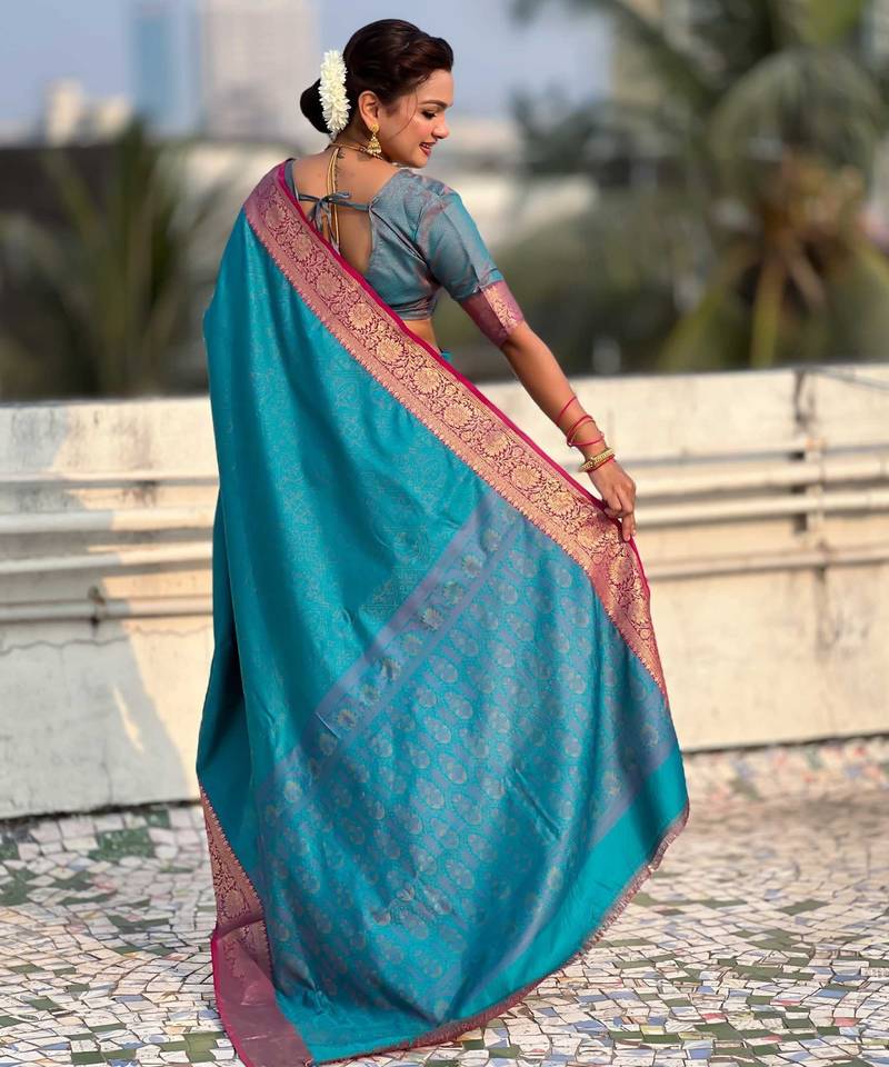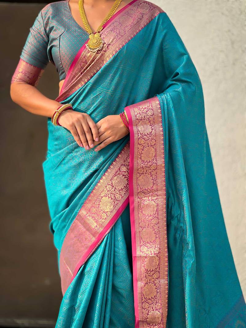 Teal contrast woven zari floral border & pallu work silk blend