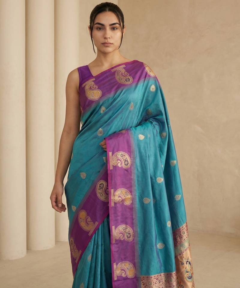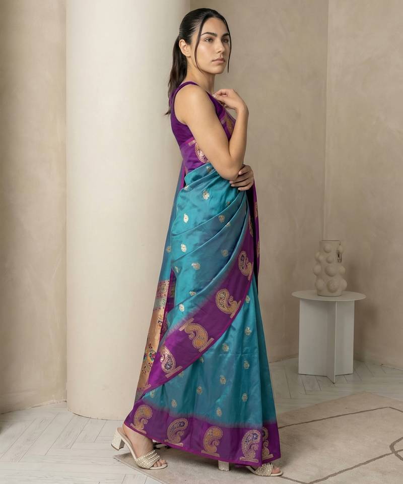 Teal gold paisley zari motifs rich silk blend fabric elegant festive & wedding wear contrast border