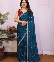 Teal soft silk crush saree with sequence embroidery work and contrast blouse piece