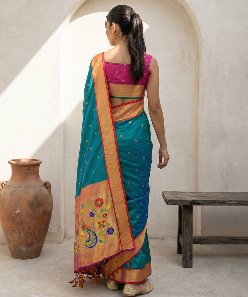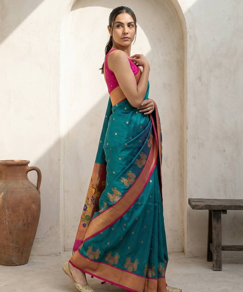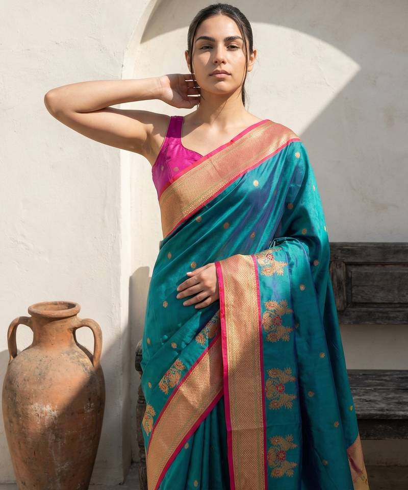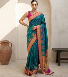 Teal woven zari buti & floral motifs work silk blend fabric traditional festive style