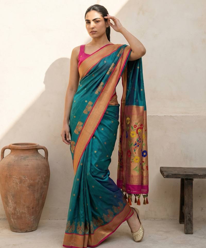 | • | Saree | : | Color- Teal / Fabric- Silk Blend |