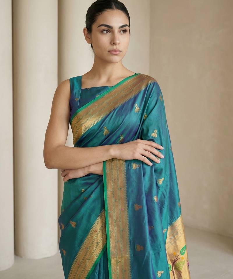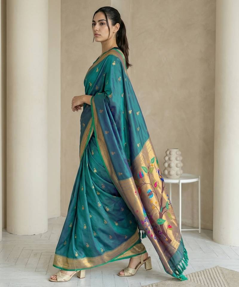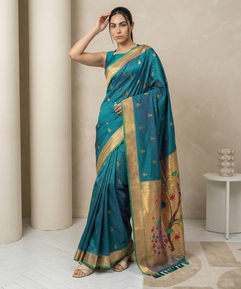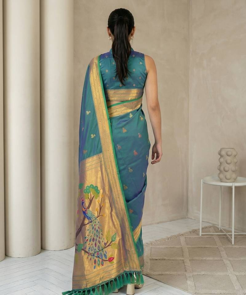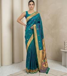 Teal woven zari buti & peacock pallu work silk blend fabric traditional festive style paithani style saree