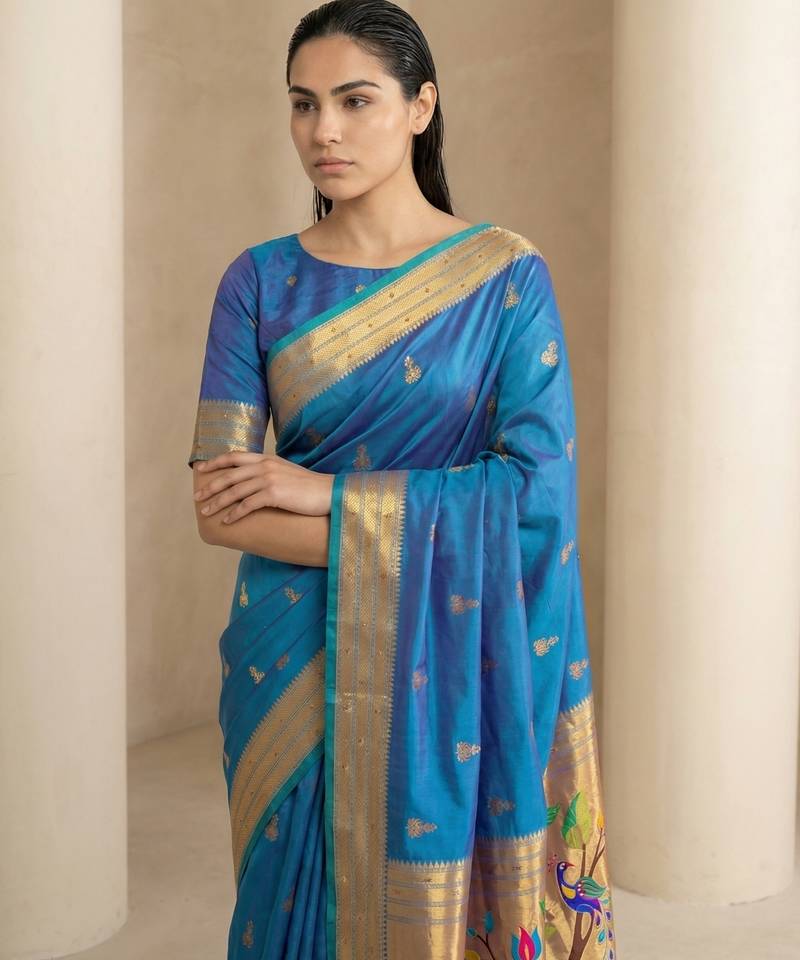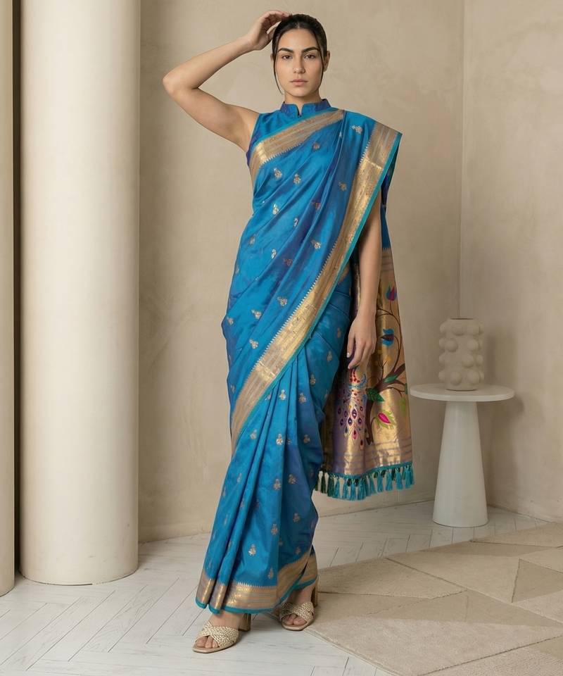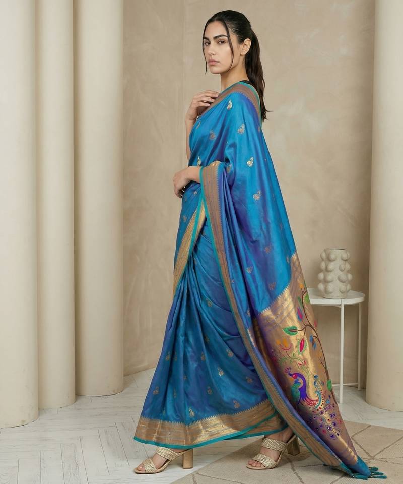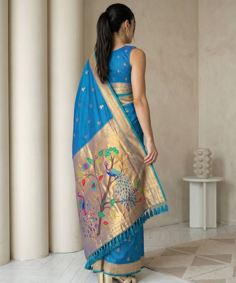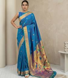 Teal woven zari buti & peacock pallu work silk blend fabric traditional festive style paithani style saree