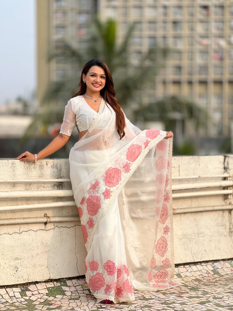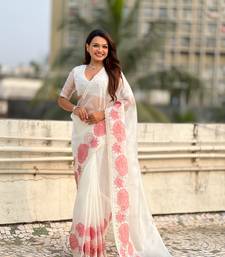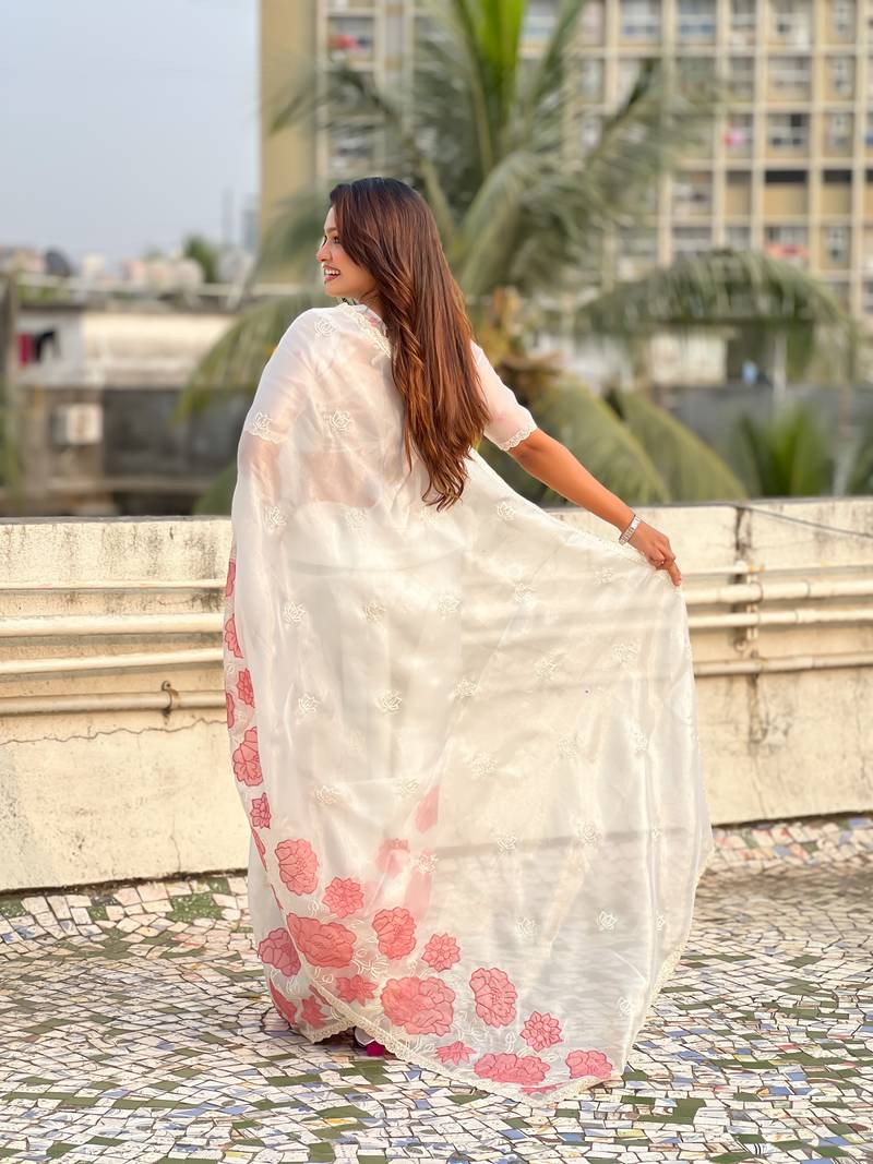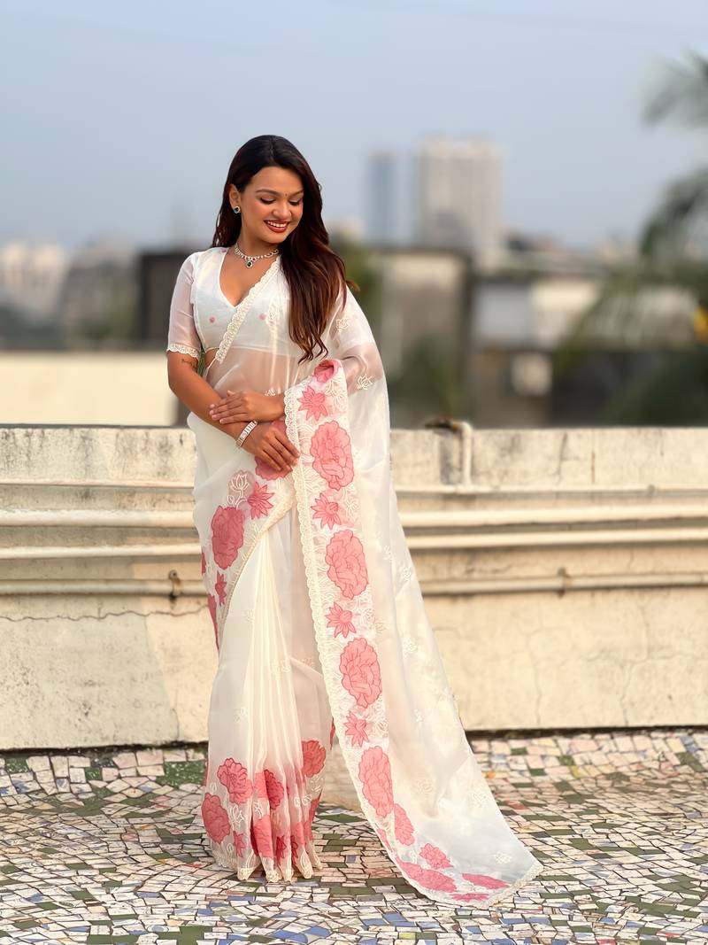 White thread embroidery floral work organza elegant party wear style designer saree with blouse piece