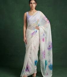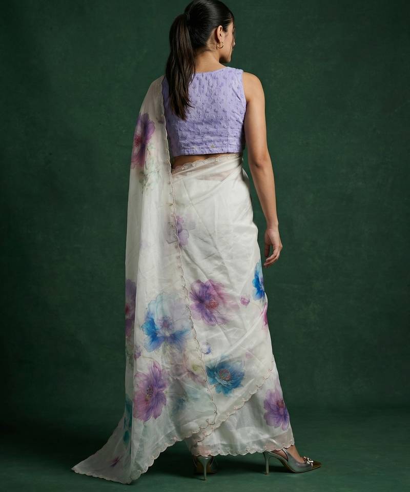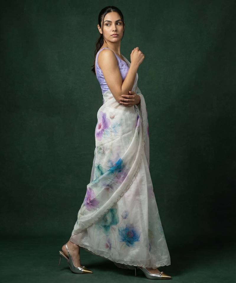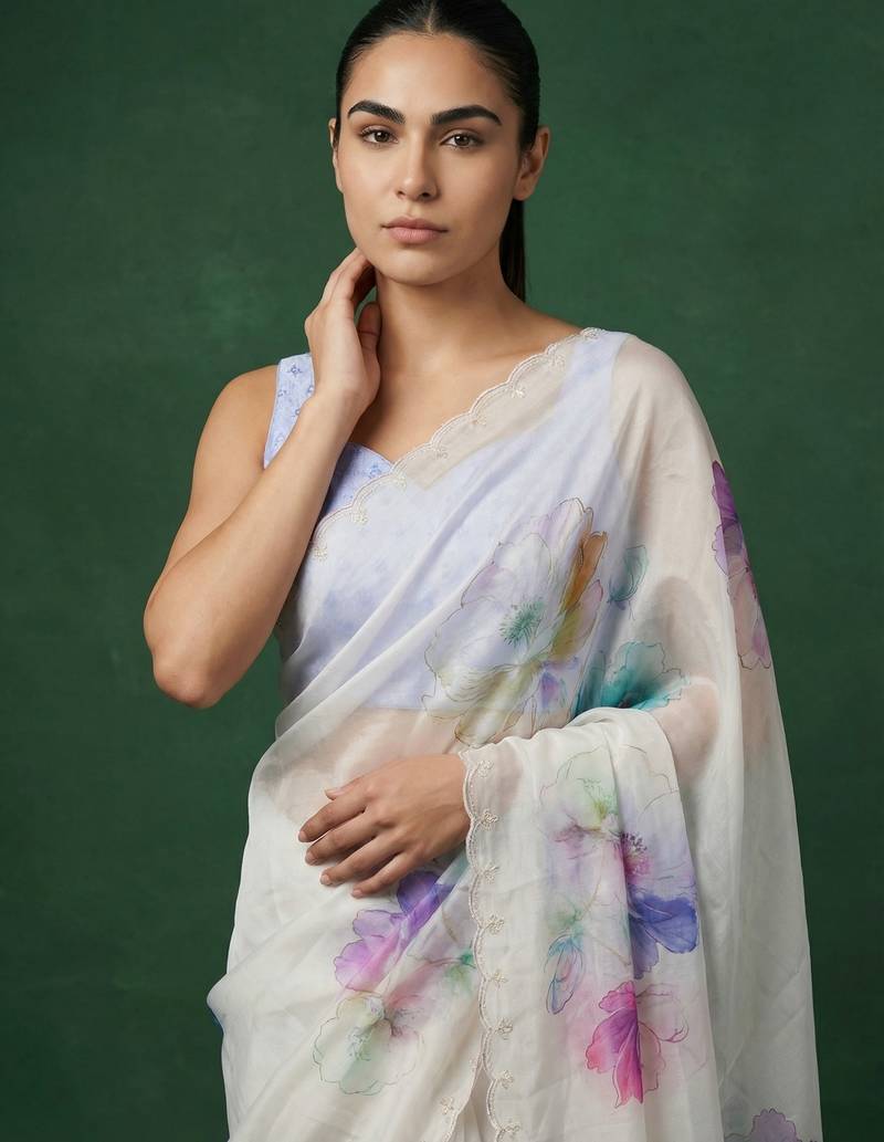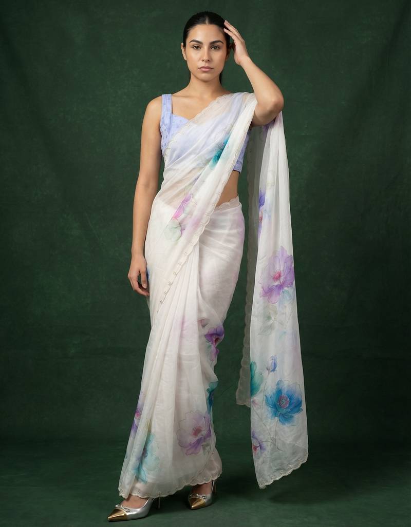 | Product Description | This Elegant White Saree Is Crafted From Lightweight Organza Fabric, Offering A Sheer Texture With A Soft And Flowy Drape. It Features Beautiful Multicolor Floral Digital Prints Spread Across The Saree, Adding A Fresh And Vibrant Look. The Subtle Scalloped Border Enhances Its Graceful Appeal While Maintaining A Modern Aesthetic. Perfect For Daytime Events, Casual Outings, And Summer Occasions, This Saree Brings A Refreshing And Stylish Vibe. Paired With A Matching Blouse Piece, It Creates A Chic And Contemporary Ethnic Ensemble. |