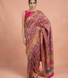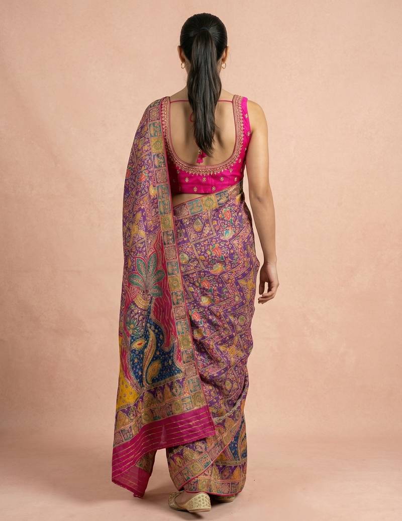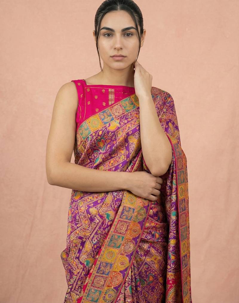 Wine printed silk blend saree with multicolor traditional border & paisley pallu | festive ethnic wear saree