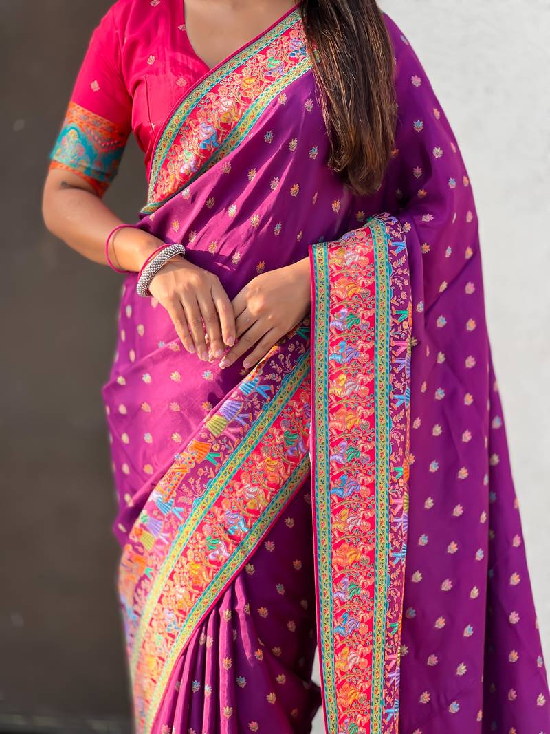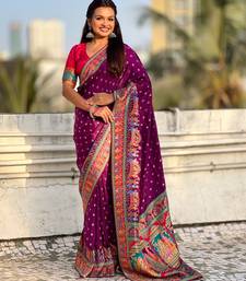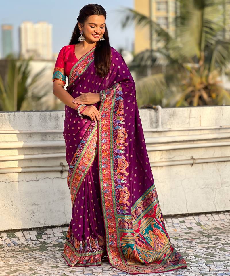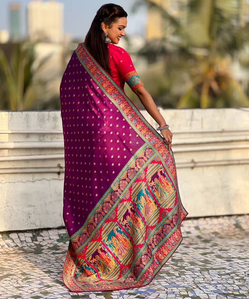 Wine silk blend saree with traditional multicolor woven border & rich pallu | festive & party wear saree