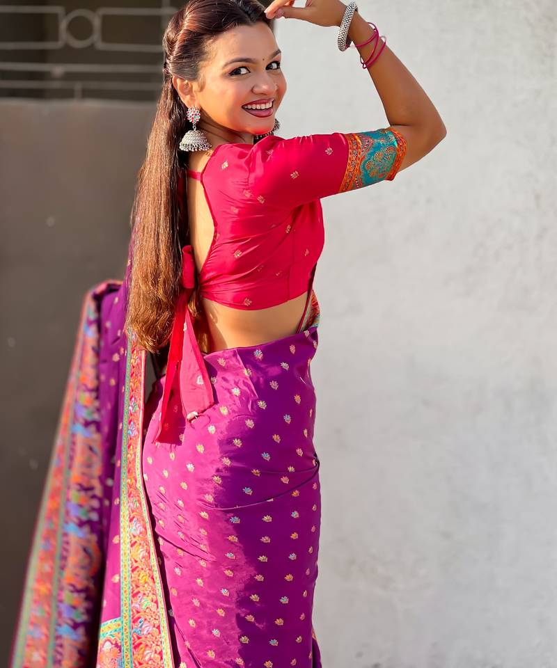 | Product Name | Wine Silk Blend Saree With Traditional Multicolor Woven Border & Rich Pallu | Festive & Party Wear Saree | |