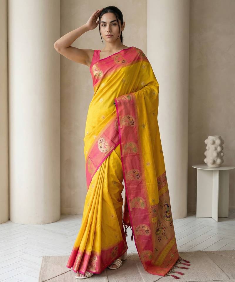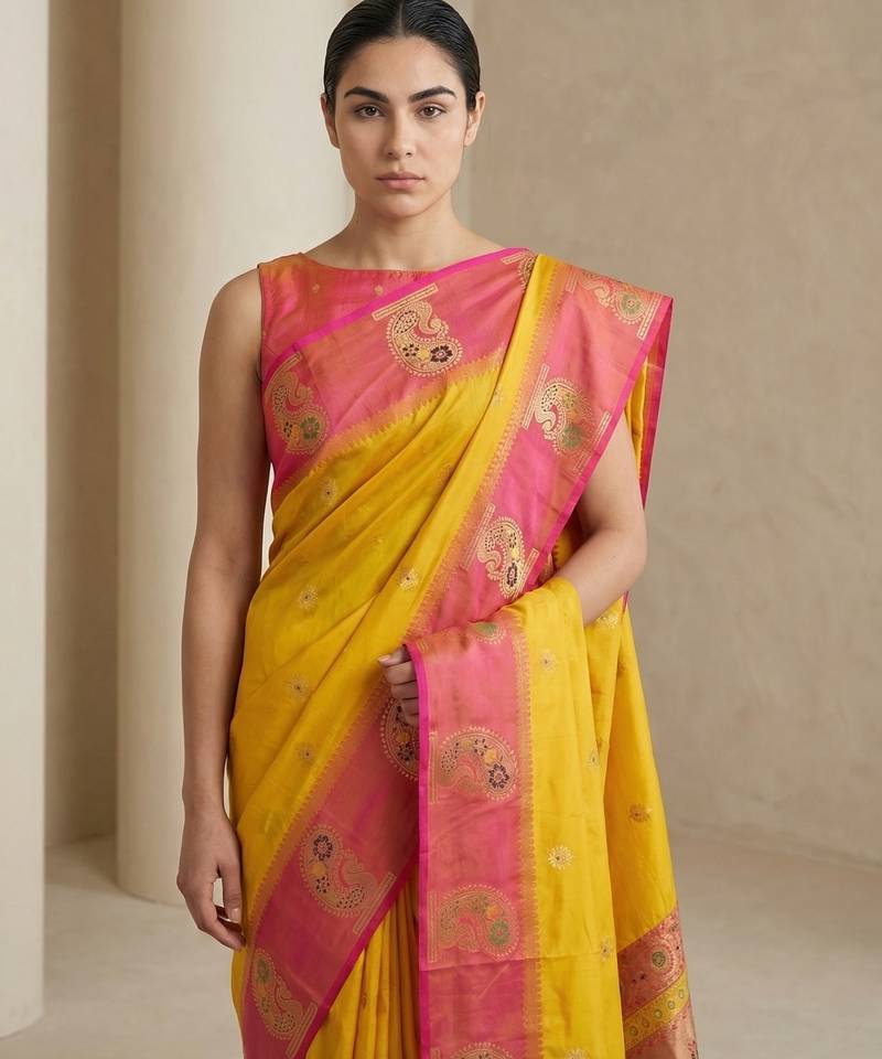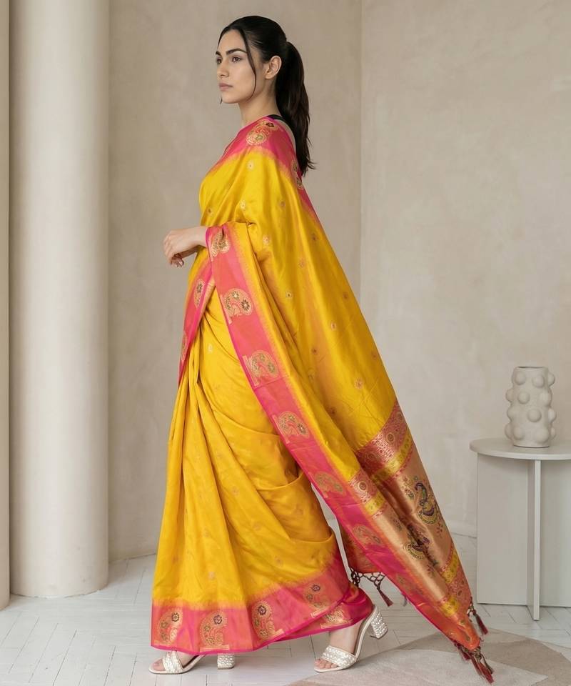 Yellow gold paisley zari motifs rich silk blend fabric elegant festive & wedding wear contrast border