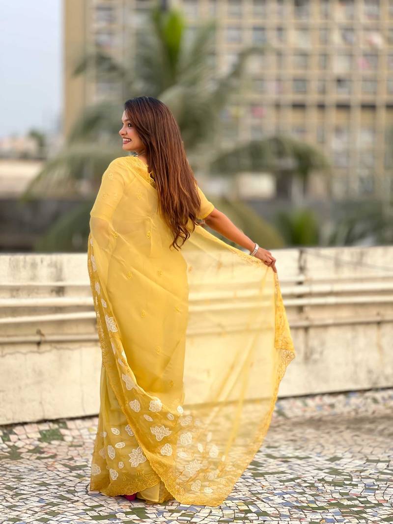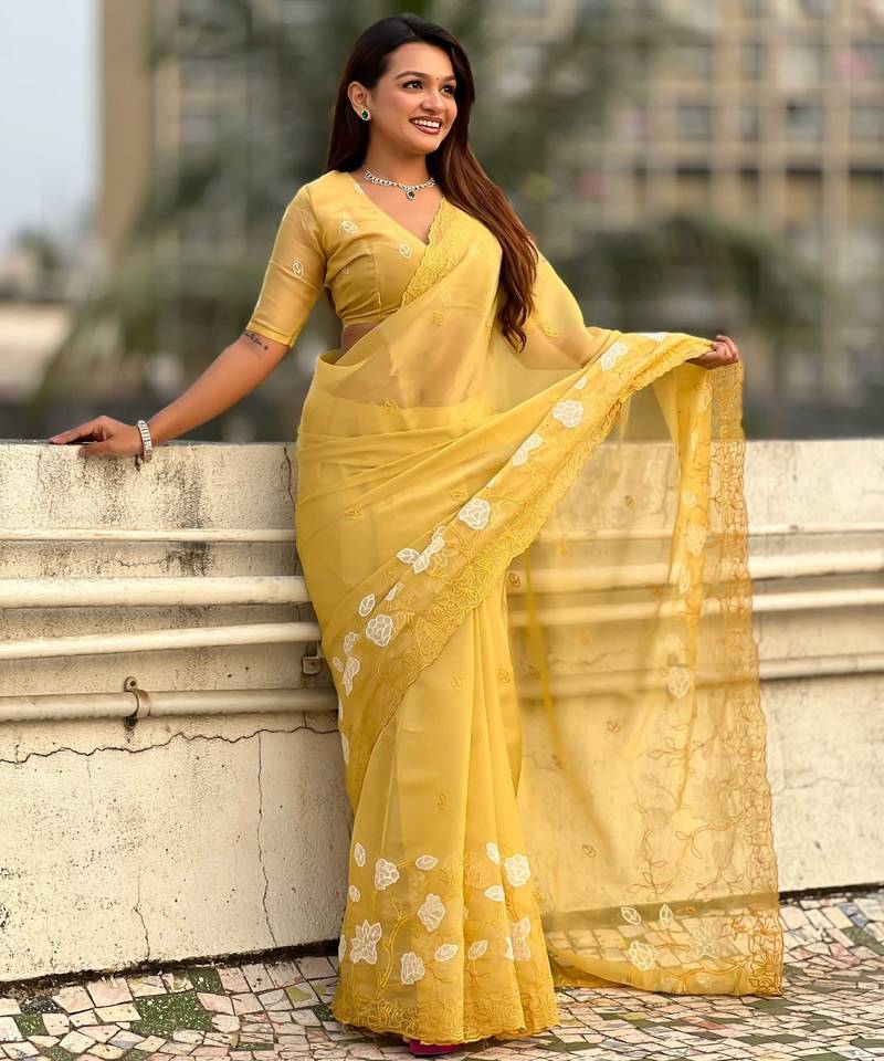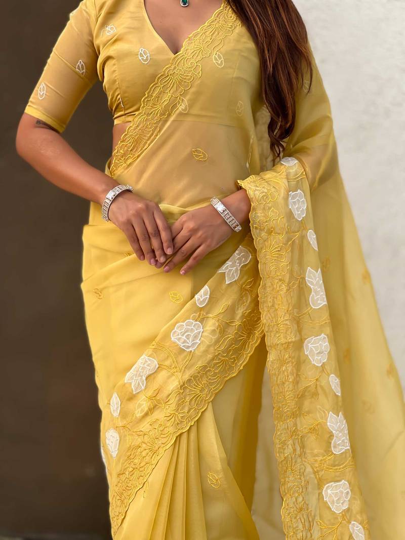 Yellow thread embroidery floral work organza party wear elegant style designer saree with blouse piece