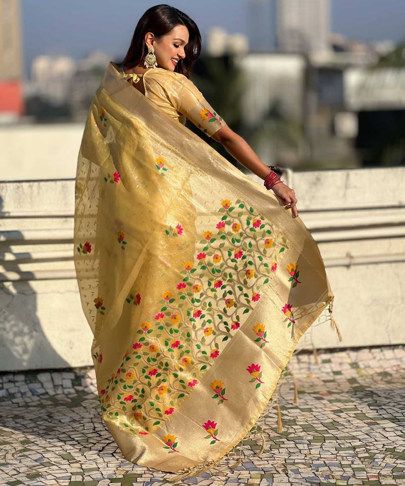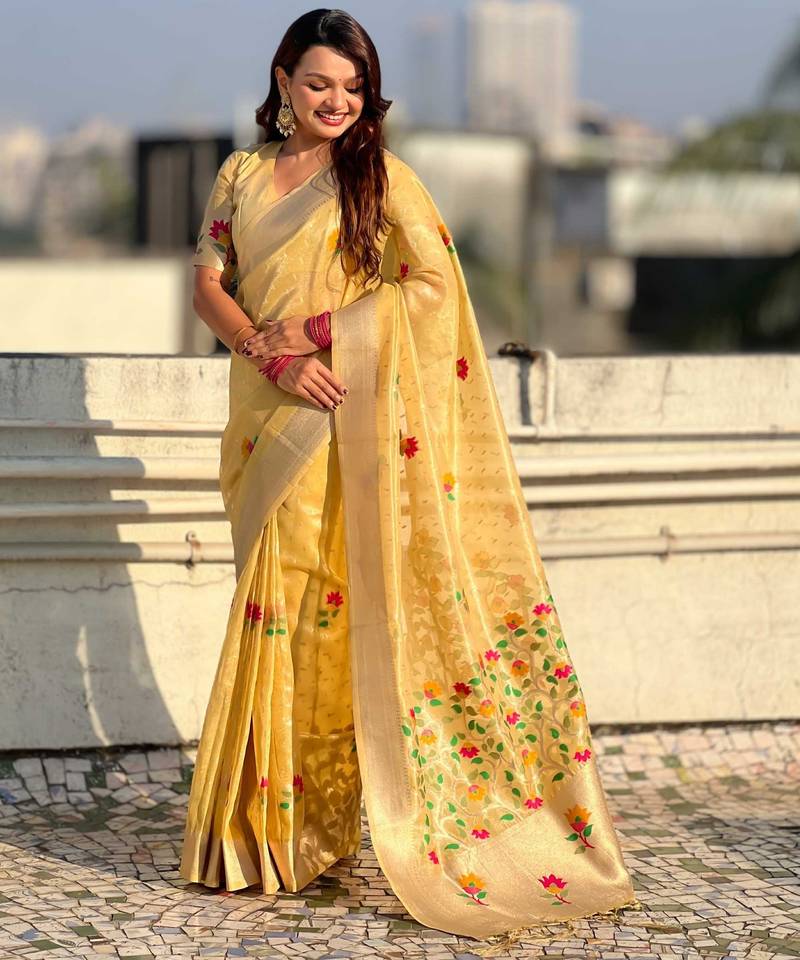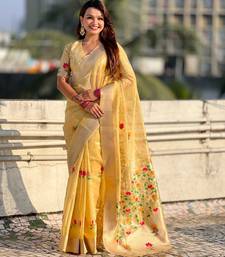 Yellow with multicolor accents woven zari floral motifs work silk blend paithani style saree with blouse piece