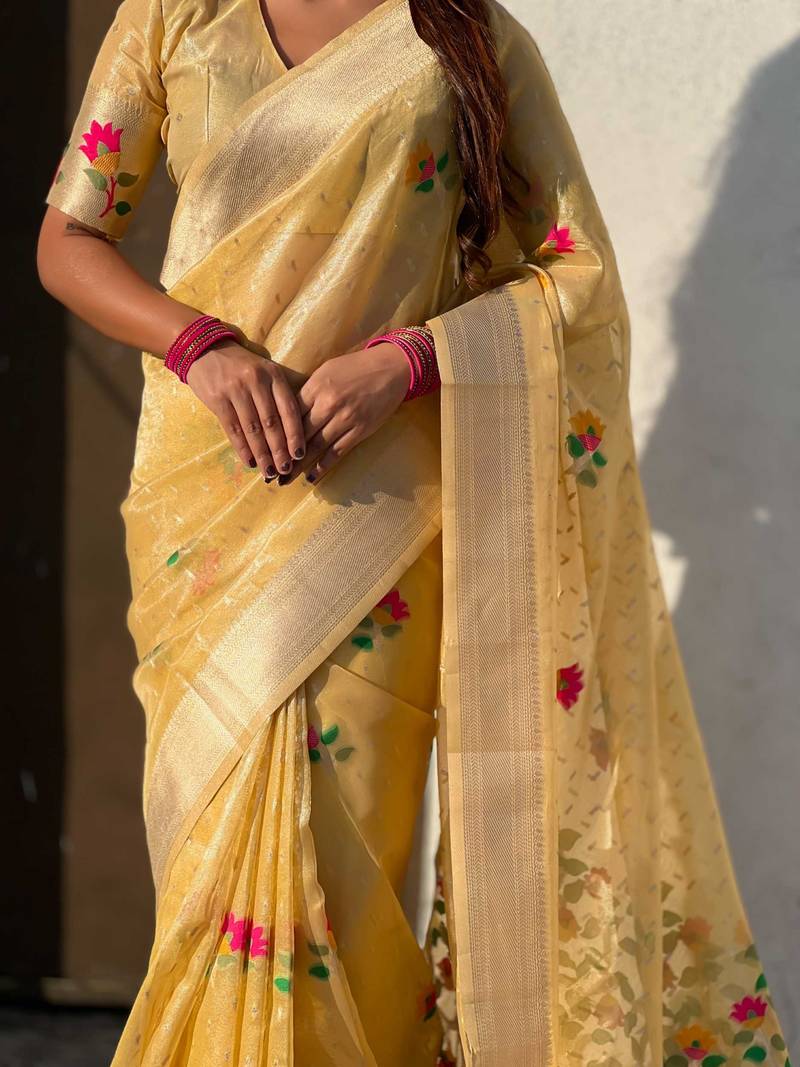 | Product Name | Yellow With Multicolor Accents Woven Zari Floral Motifs Work Silk Blend Paithani Style Saree With Blouse Piece | |