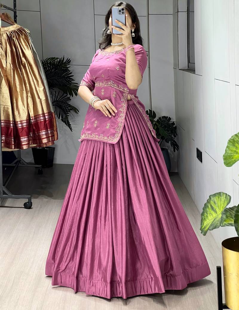 Onion color plain with embroidery top chinon lehenga fully stitched fancy sets
