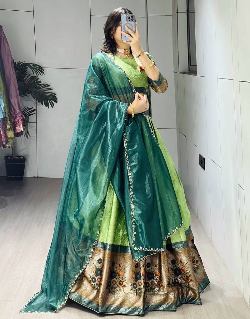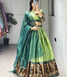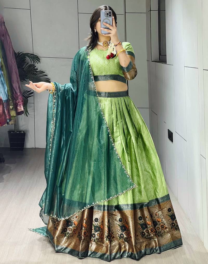 Parrot color silk kalamkari zari weaving border lehenga choli with unstitched blouse