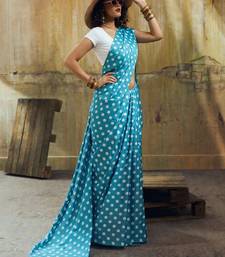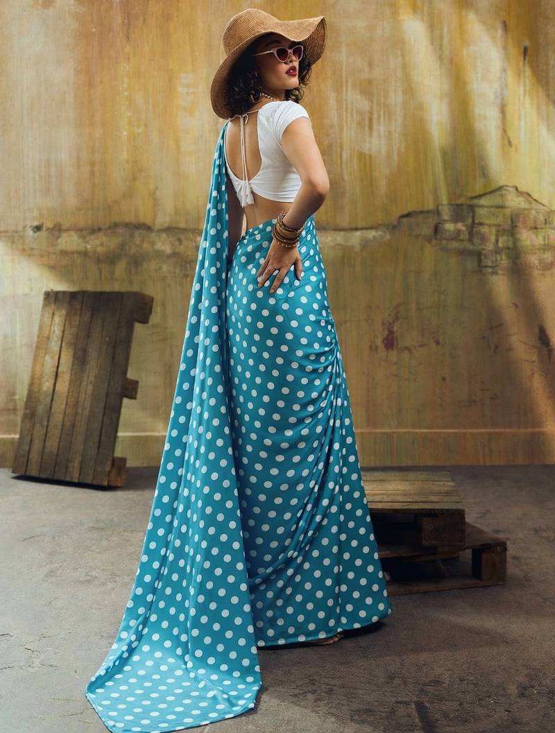 Rama & white color polka dots printed japan satin saree with unstitched blouse
