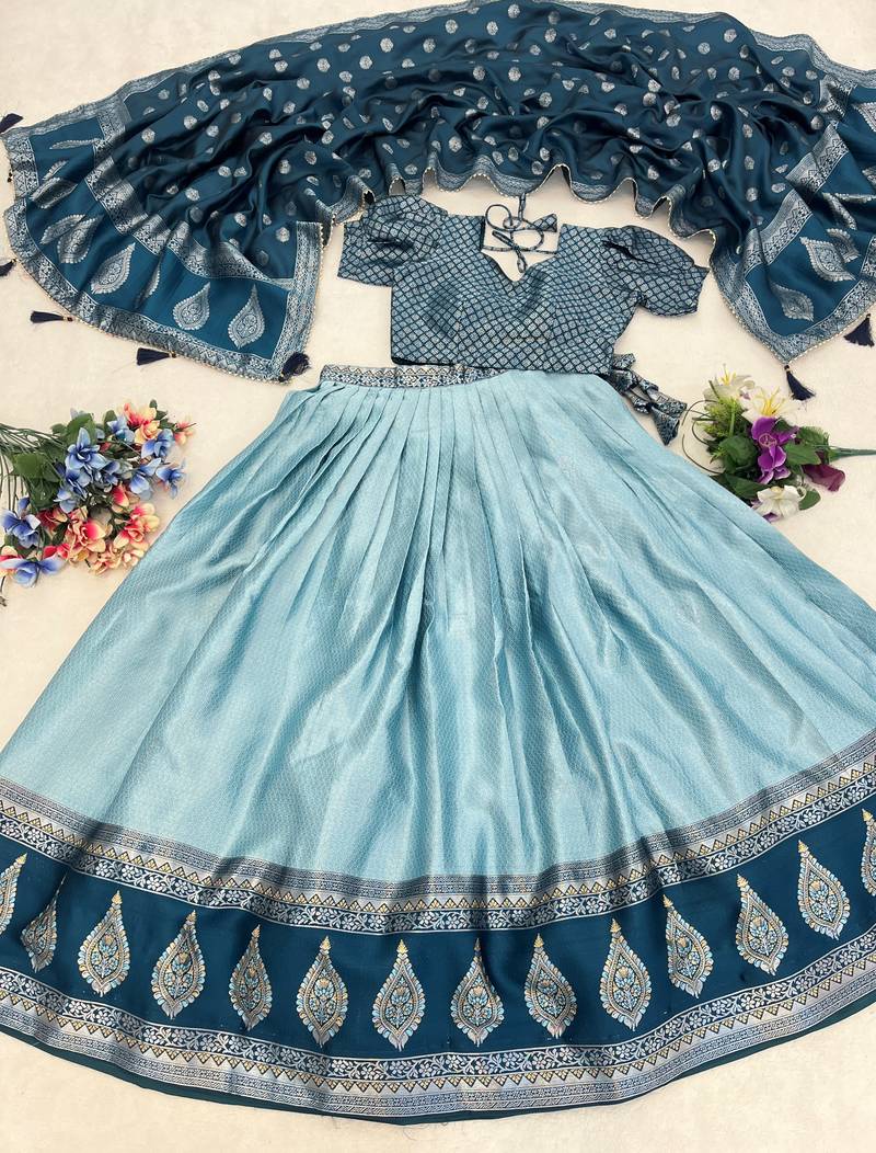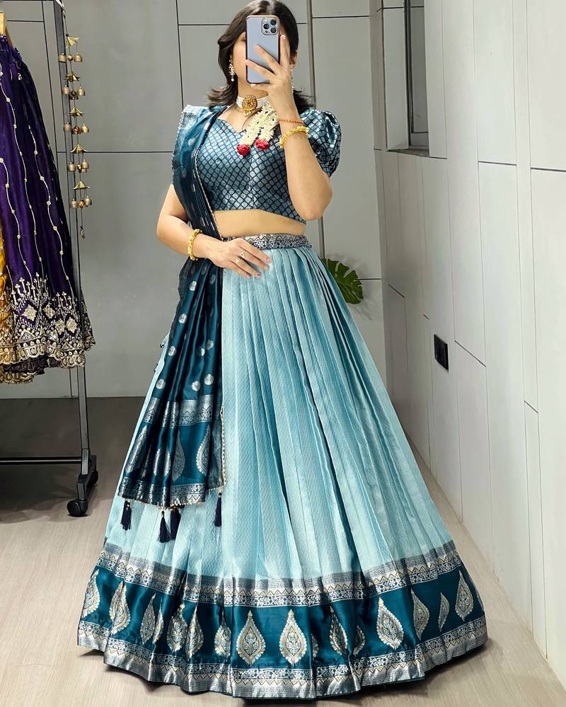 Sky color zari weaving work kanchipuram silk pattu lehenga choli with unstitched blouse