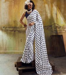White & neavy-blue color polka dots printed japan satin saree with unstitched blouse