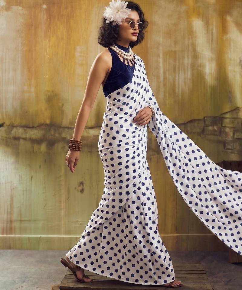 | Product Name | White & Neavy Blue Color Polka Dots Printed Japan Satin Saree With Unstitched Blouse | |