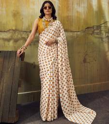White & orange color polka dots printed japan satin saree with unstitched blouse