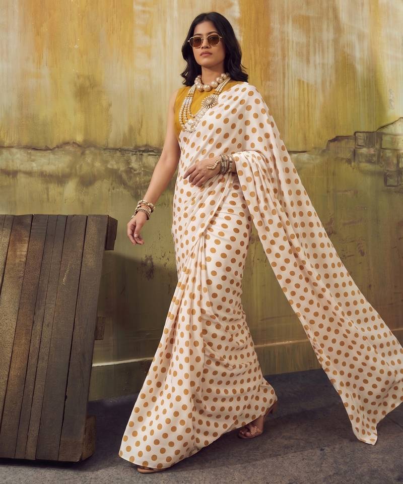 | Product Name | White & Orange Color Polka Dots Printed Japan Satin Saree With Unstitched Blouse | |