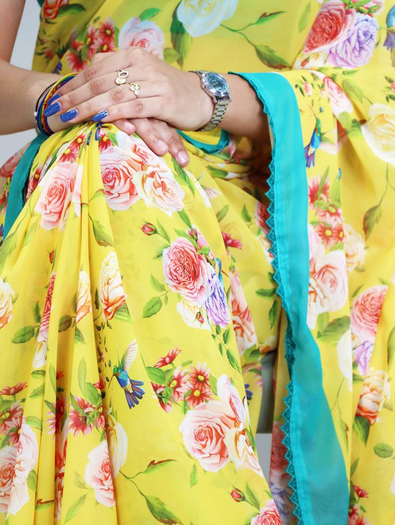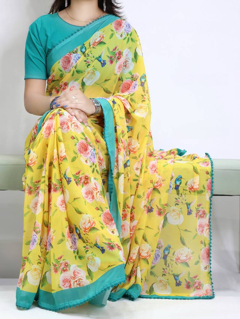 | Product Name | Yellow Color All Over Floral Printed With Premium Lace Border Weightless Saree With Unstitched Blouse | |