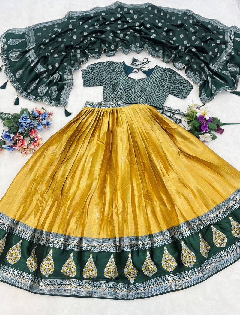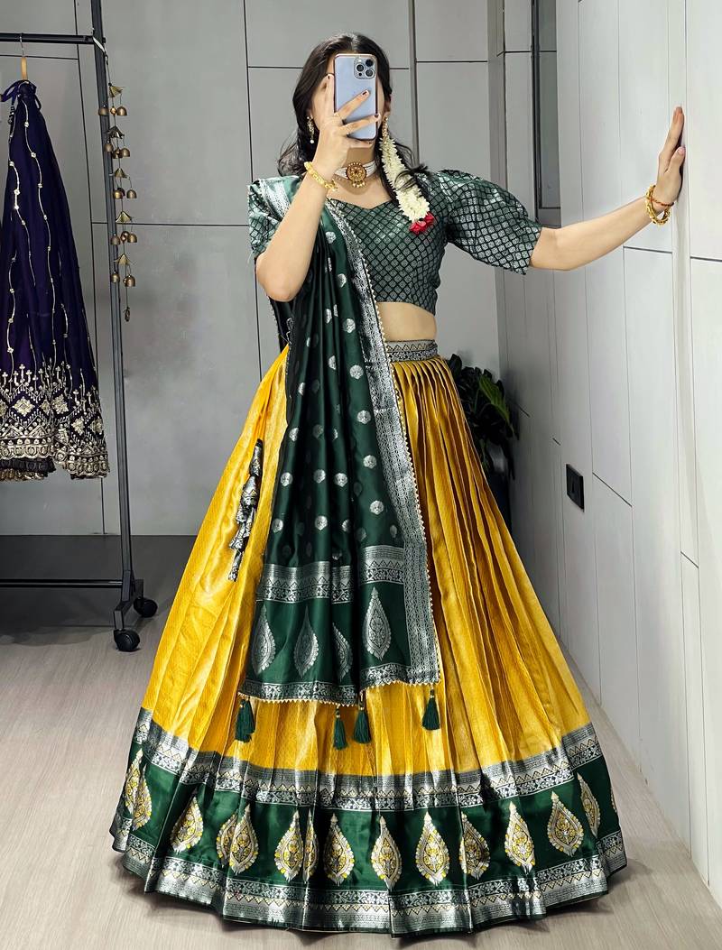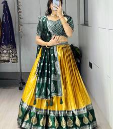 Yellow color zari weaving work kanchipuram silk pattu lehenga choli with unstitched blouse