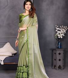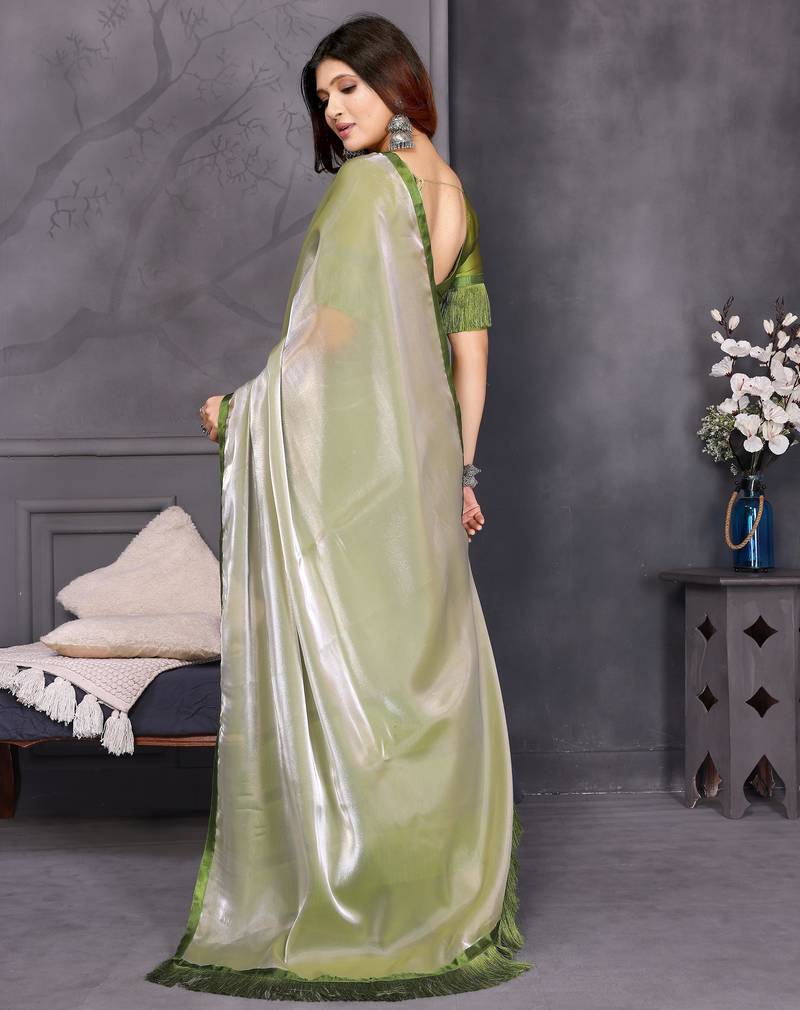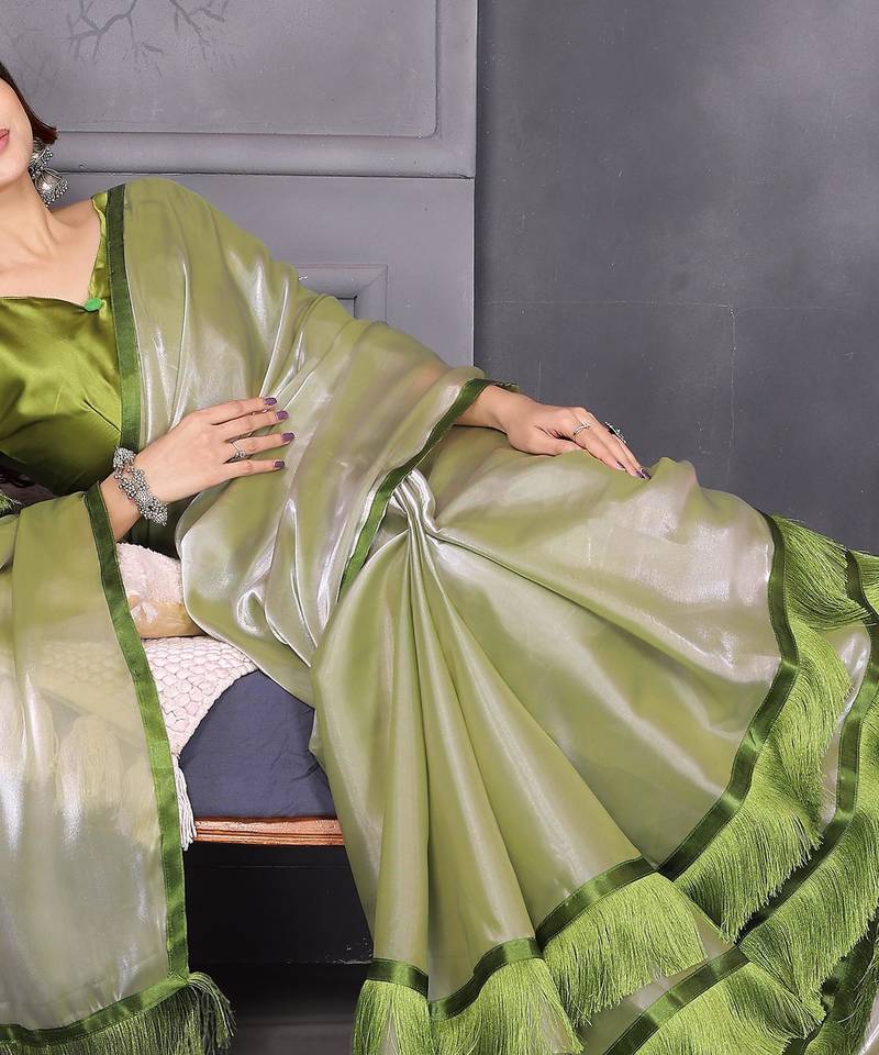 Resham sutra green silk blend tassel saree with satin gold blouse piece