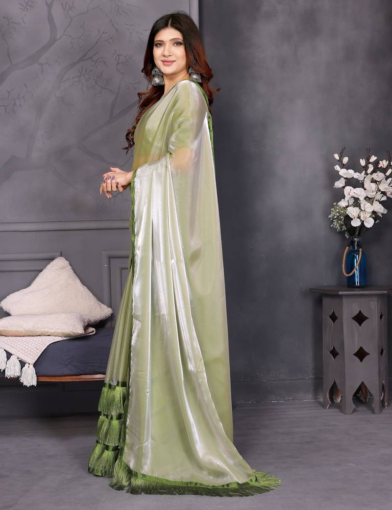 | Product Name | Resham Sutra Green Silk Blend Tassel Saree With Satin Gold Blouse Piece | |
