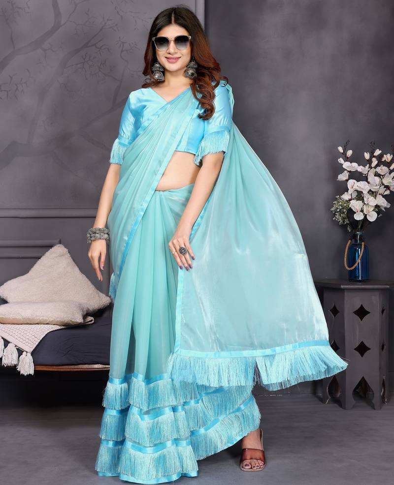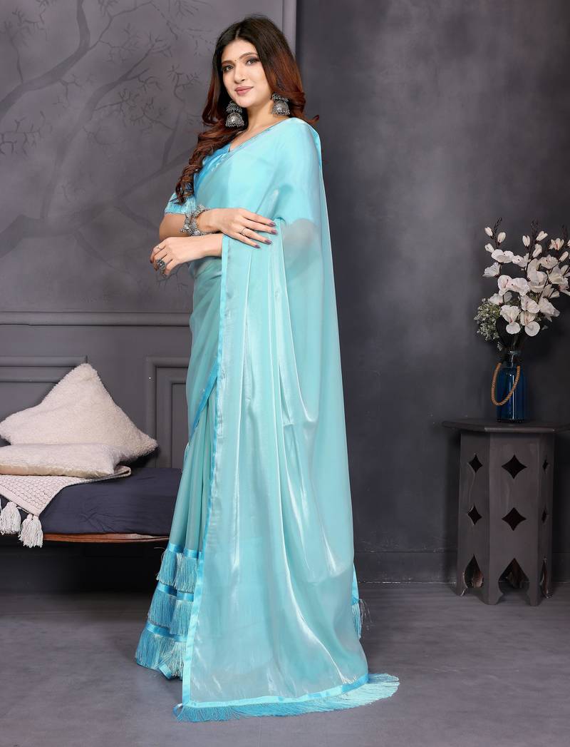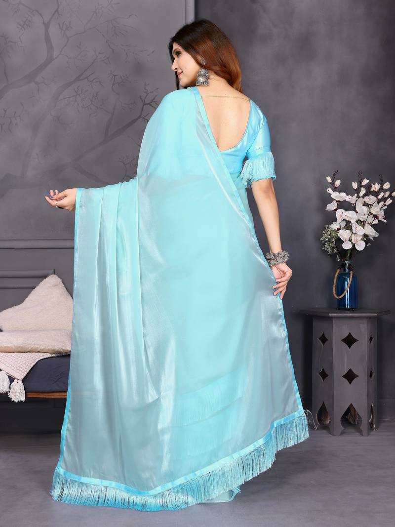 | Product Name | Resham Sutra Sky Blue Silk Blend Tassel Saree With Satin Gold Blouse Piece | |