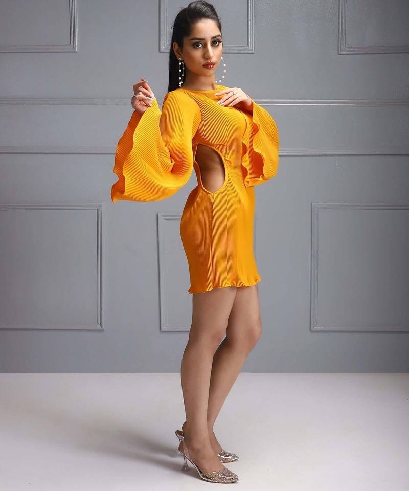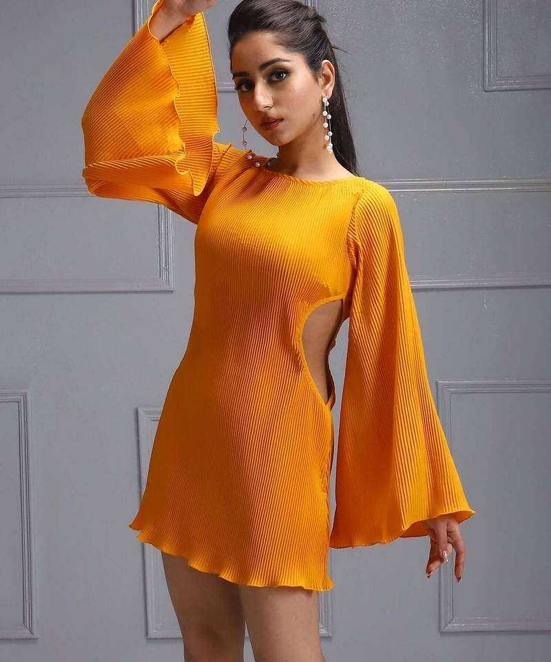 | Product Name | Orange Pleated Bell Sleeve Dress | |