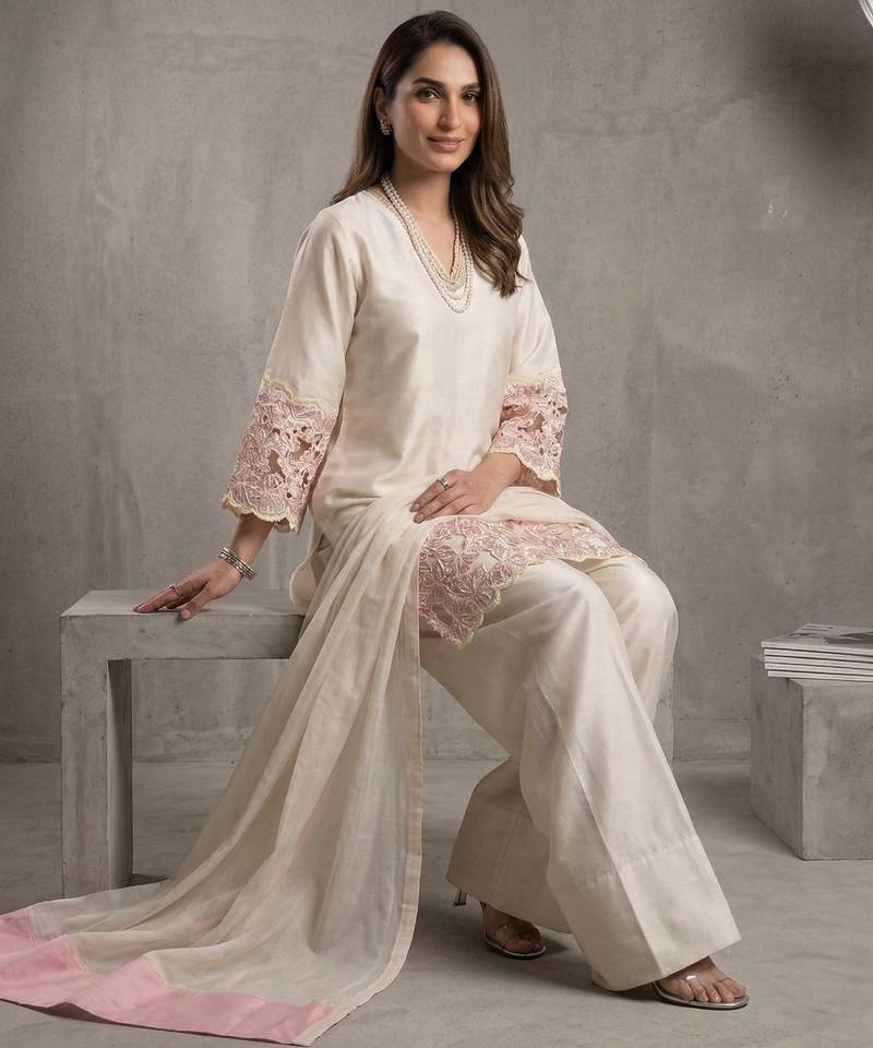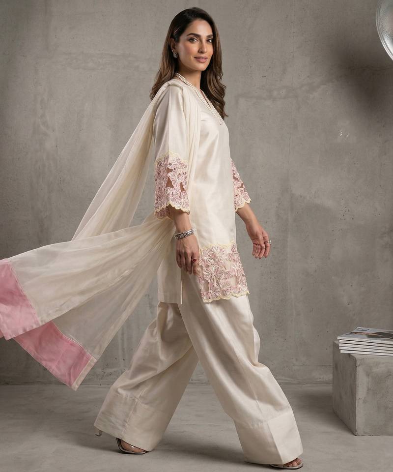 Designer ivory kurta palazzo set with pink floral lace work stitched