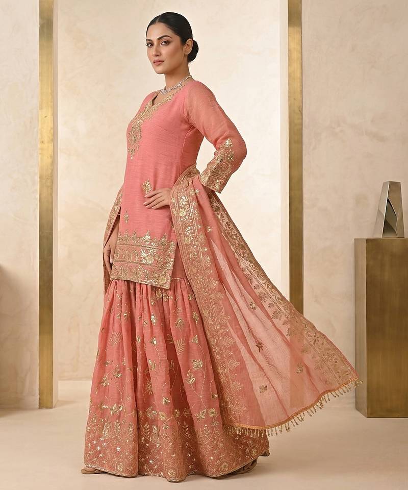 Peach heavy crunchy silk embroidered and sequins work salwar suit stitched