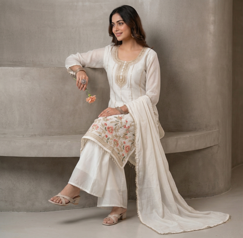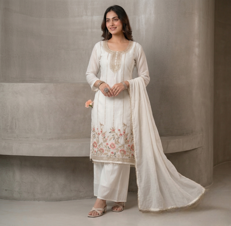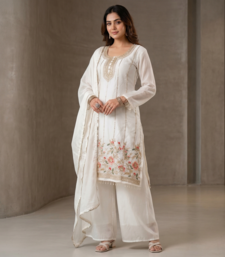 | Product Name | White Embroidery Work Fandi Silk Top & Plazzo With Dupatta | |