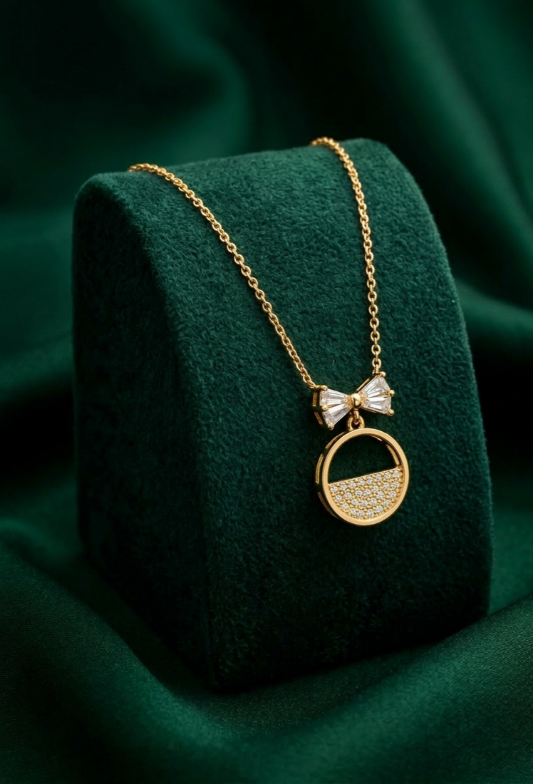 | Product Name | 925 Sterling Silver Gold Plated Bow & Circle Pendant Necklace With Crystal Detailing For Women | |