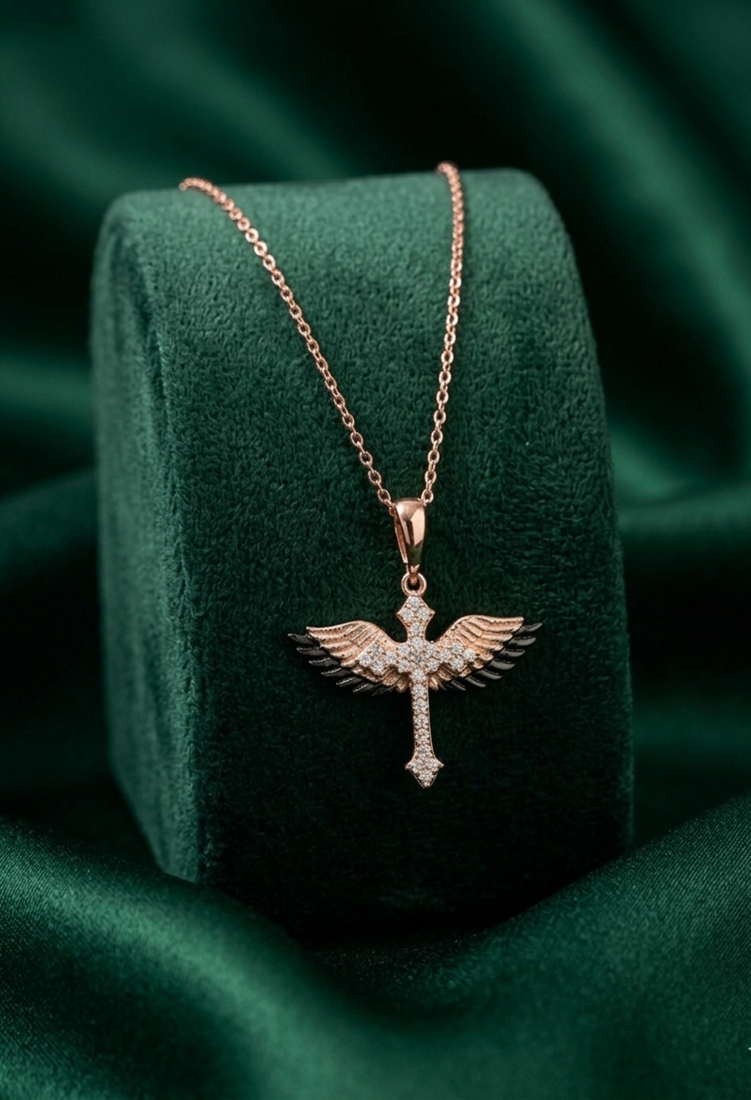 | Product Name | 925 Sterling Silver Rose Gold Plated Winged Cross Pendant Necklace With Crystal Detailing For Women | |