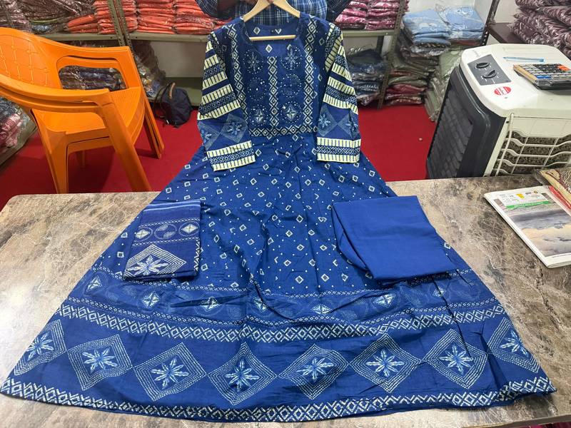 | Product Description | The Blue And White Printed Garment In The Selected Region Is A Cotton A Line Kurti Set. This Ethnic Outfit Typically Includes A Flared Anarkali Style Kurta, Matching Palazzo Pants Or Trousers, And A Coordinating Dupatta. The Specific Design Features Intricate Geometric And Ethnic Motifs, A Round Neckline, And Three Quarter Sleeves. Some Versions Of This Set Include Sequence Embroidery Work On The Yoke And Designer Sleeves. |