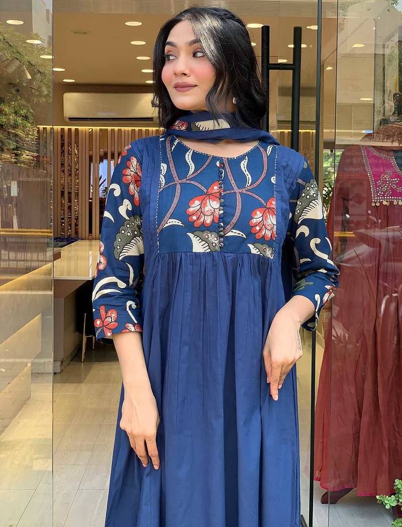 Beautiful jaipuri a blue colored cotton anarkali kurta set with printed trousers and a solid blue dupatta.