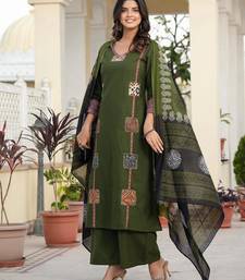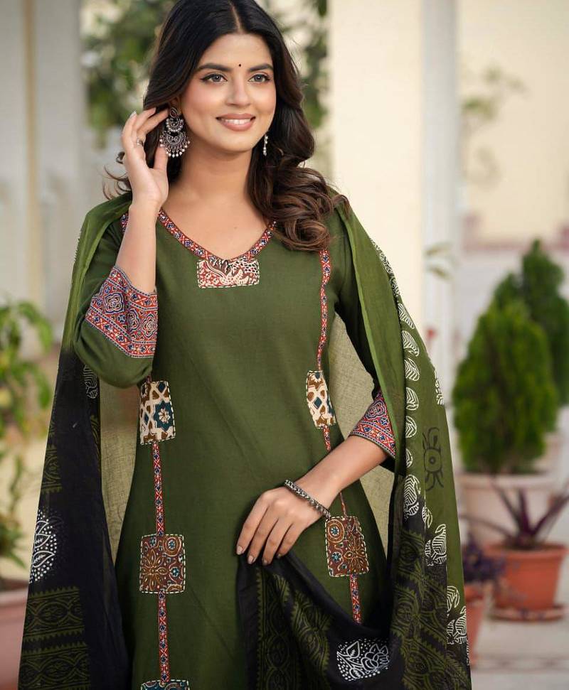 | Product Description | A Dark Green Cotton Straight Kurta Set Adorned With Traditional Patch Work And Hand Katha Work. This Ethnic Ensemble Typically Includes A Straight Cut Kurti, Matching Palazzo Pants, And A Coordinated Printed Dupatta. |
