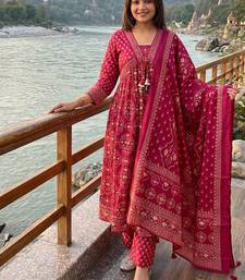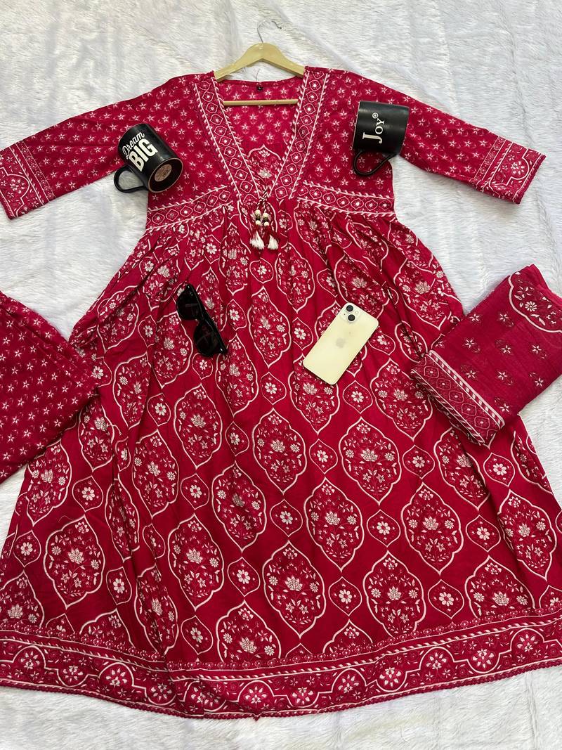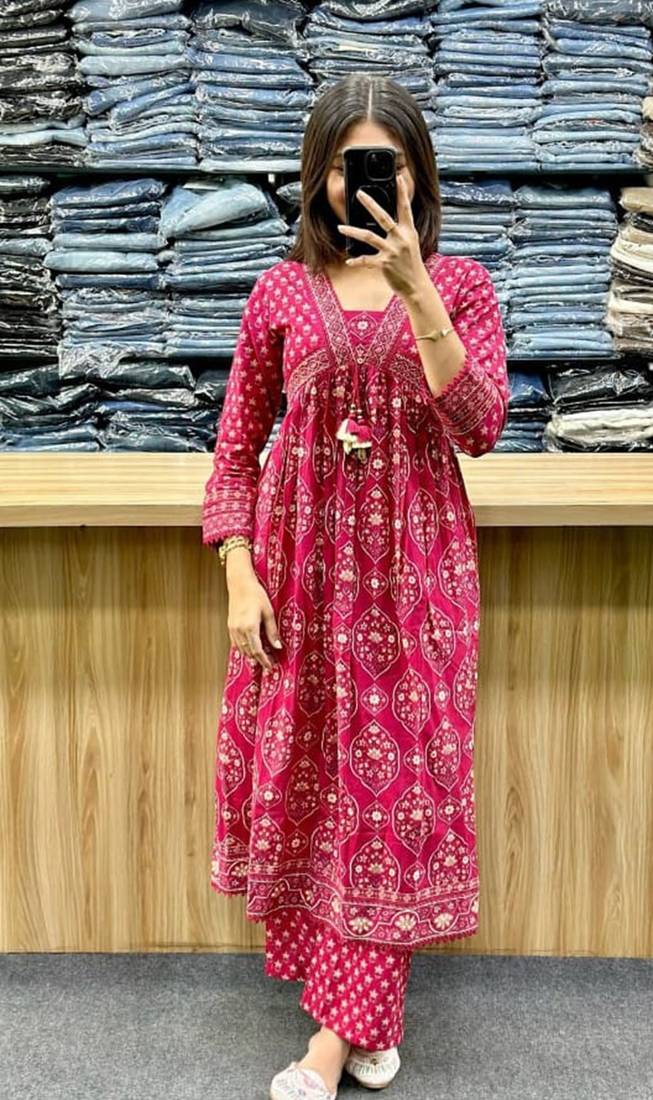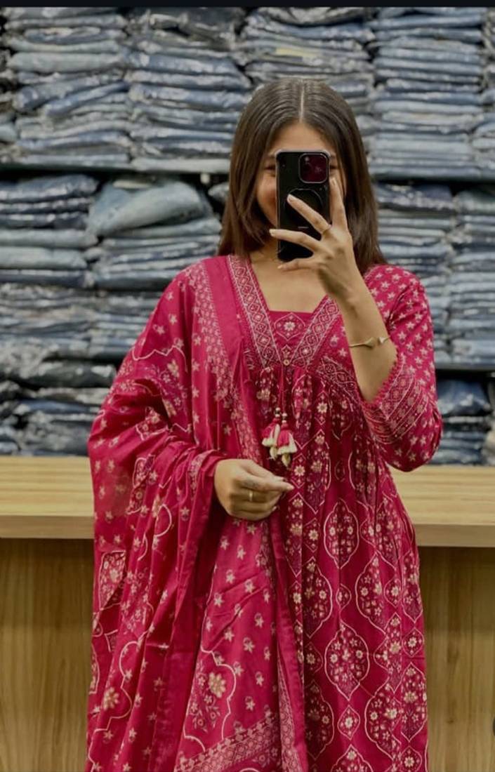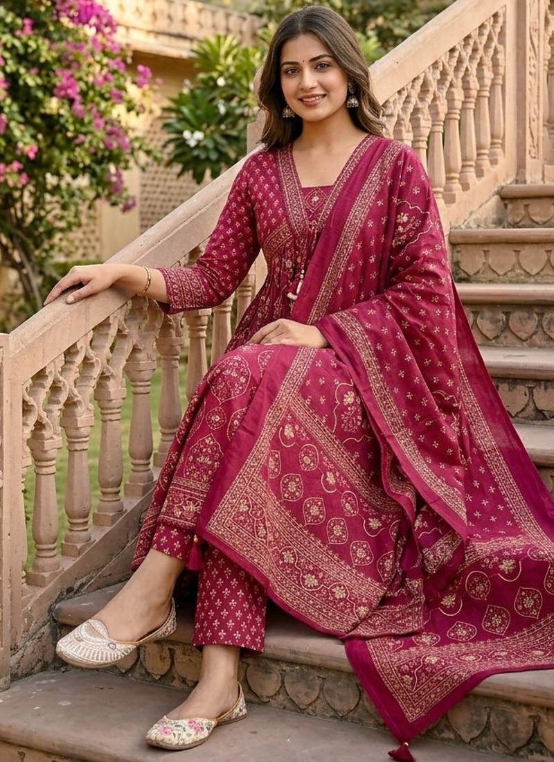 | Product Description | A Rani Pink Colored Anarkali Suit Set, Typically Featuring A Long, Flared Top (Kurta), Matching Trousers, And A Dupatta. The Set Is Commonly Crafted From Premium Cotton And Often Includes Decorative Elements Like Traditional Gold Prints, Embroidery On The Neck And Sleeves, And Tassel Details On The Dupatta. |