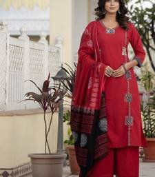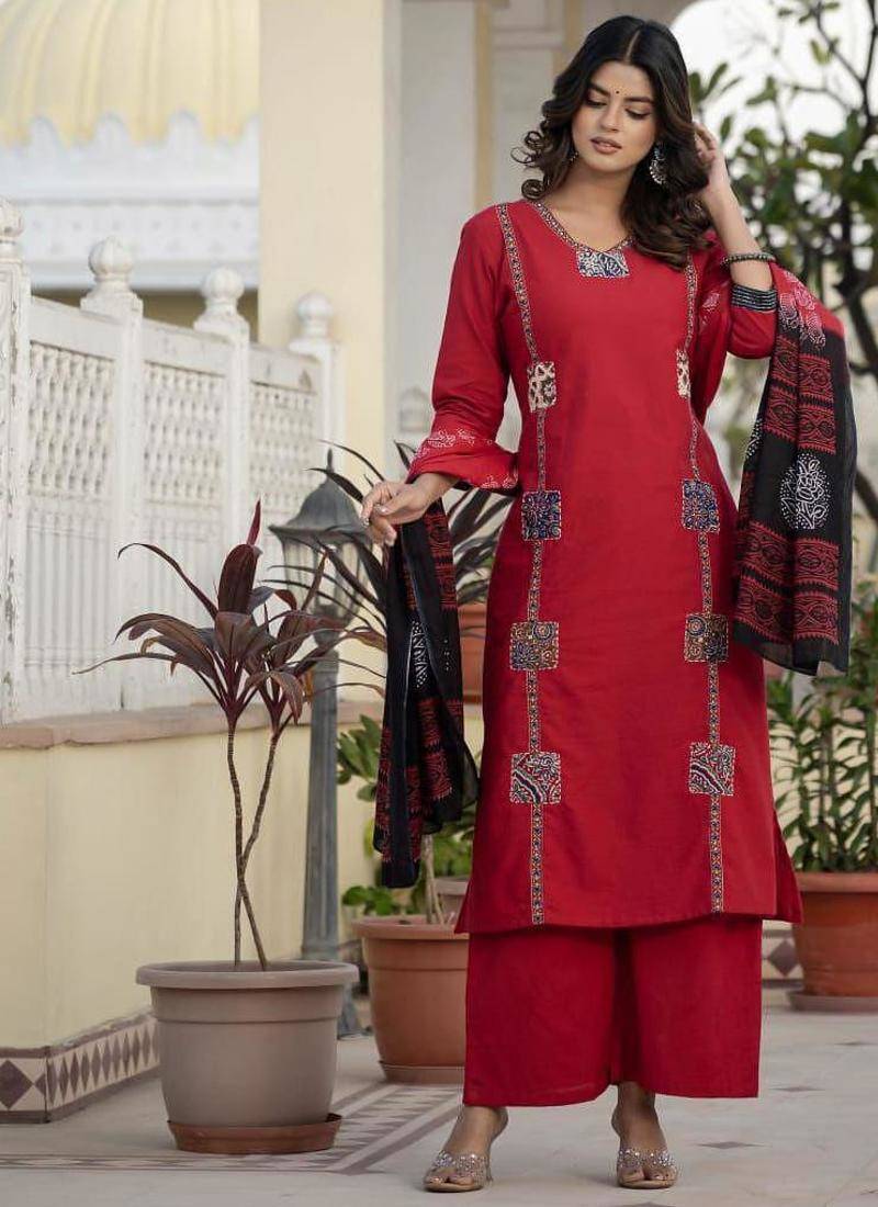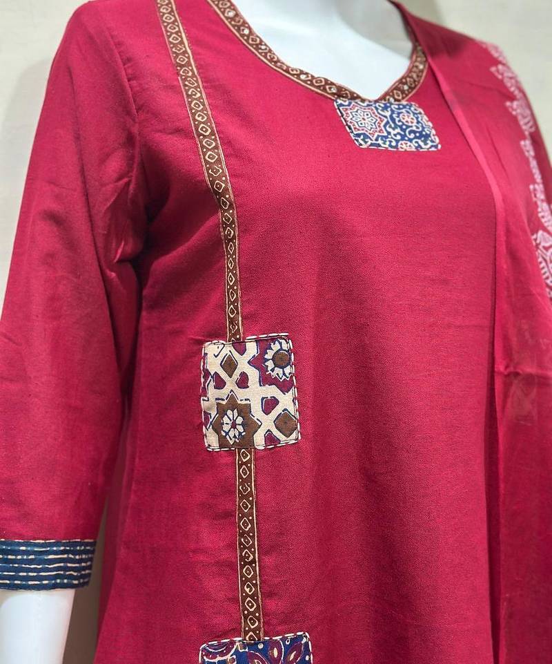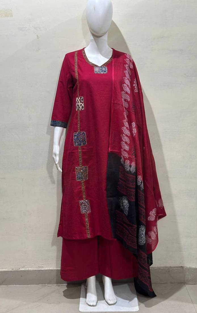 | Product Description | A Dark Red Cotton Straight Kurta Set Adorned With Traditional Patch Work And Hand Katha Work. This Ethnic Ensemble Typically Includes A Straight Cut Kurti, Matching Palazzo Pants, And A Coordinated Printed Dupatta. |