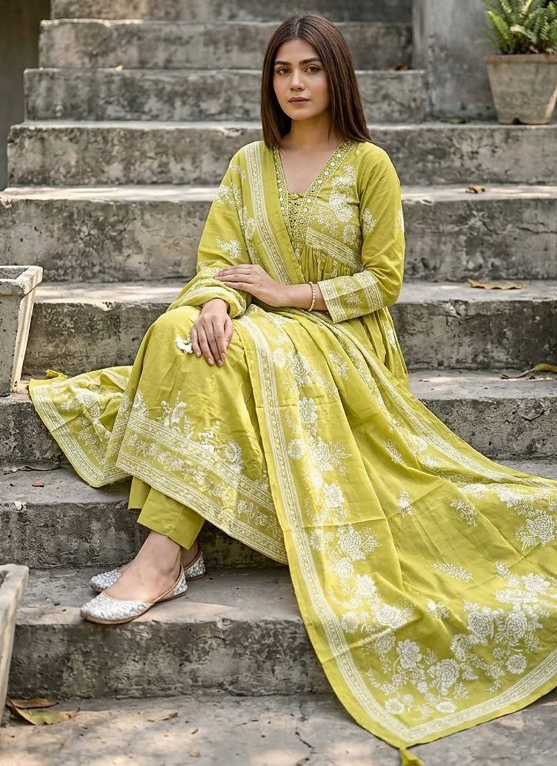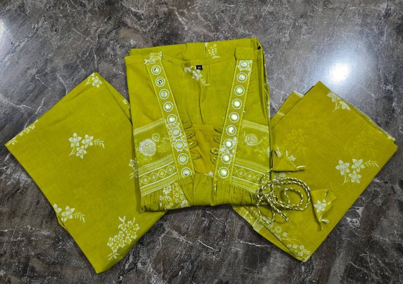 | Product Description | A Mehendi Green Cotton Kurti Pant Dupatta Set Featuring A Floral Printed Design And A Flared, Flowy Silhouette. This Ethnic Ensemble Typically Includes A Soft Cotton Kurti With A V Neckline, Paired With Matching Pants And A Printed Cotton Dupatta With Elegant Borders |