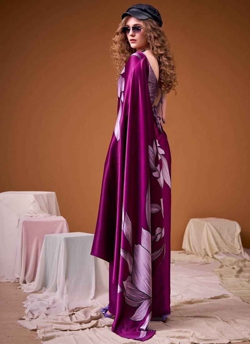 Party wear satin silk floral printed saree with unstitched blouse