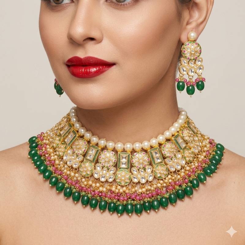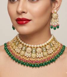 Exquisite gold-plated kundan bridal choker set with emerald green beads - traditional ethnic indian jewelry