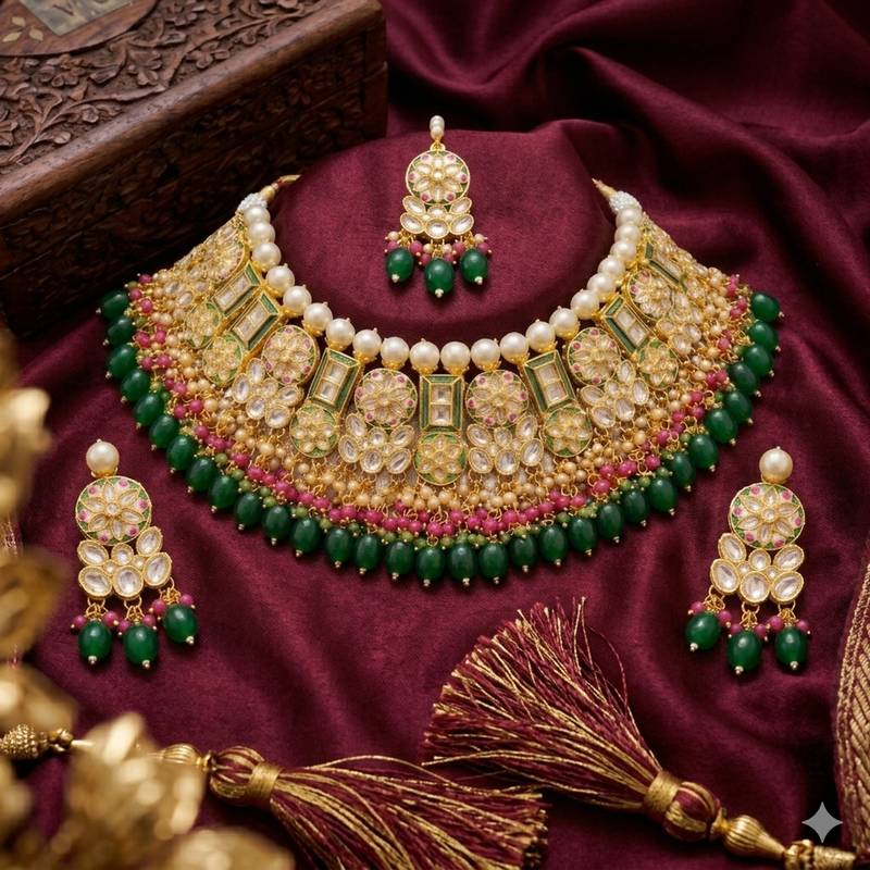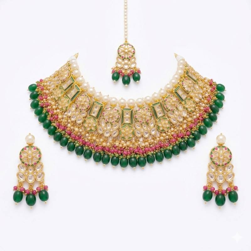 | Product Name | Exquisite Gold Plated Kundan Bridal Choker Set With Emerald Green Beads Traditional Ethnic Indian Jewelry | |